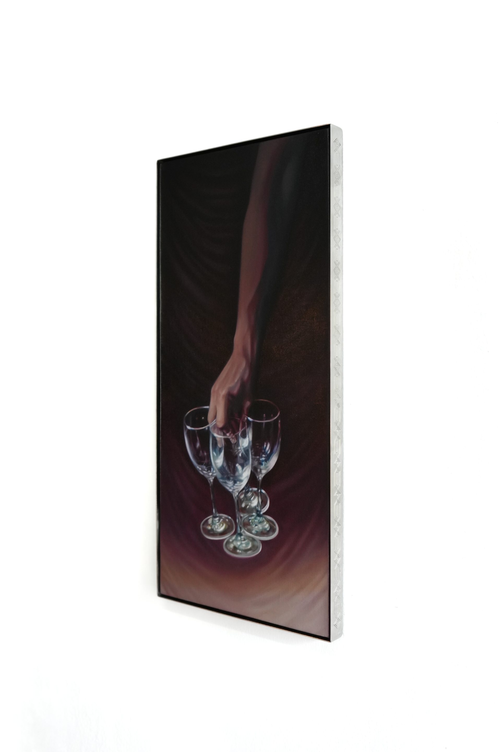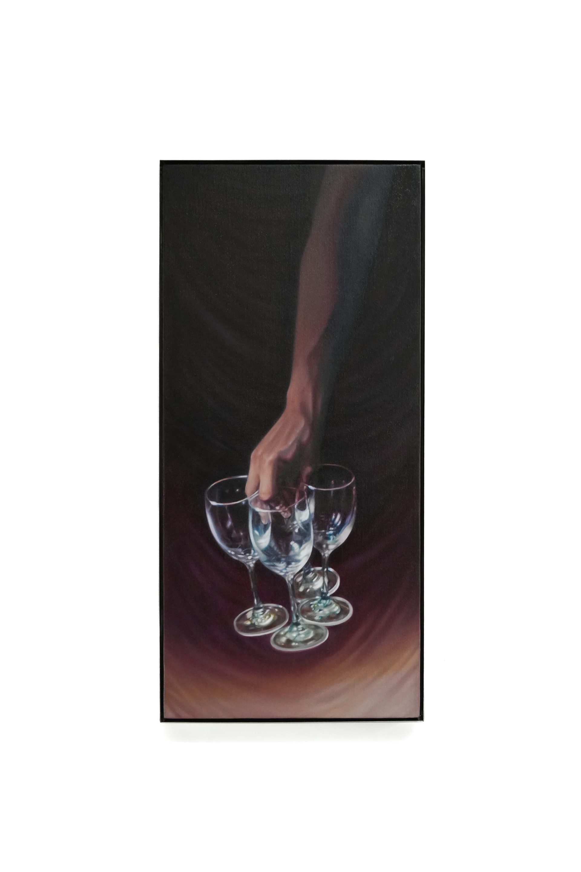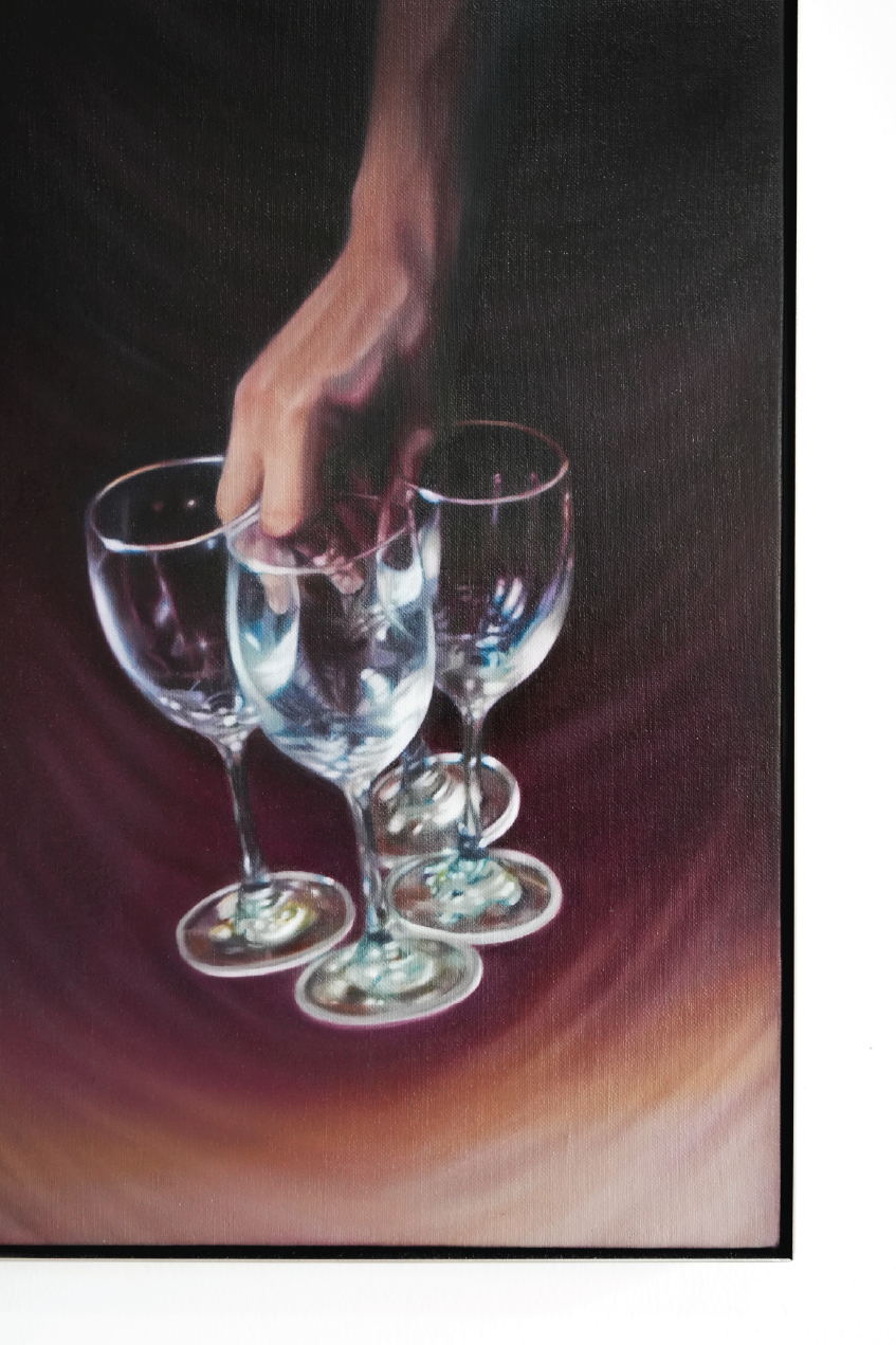 “Lilac Wine and The More the Merrier are part of a series examining the mise-en-scène of restaurants: details such as wine glasses, drapery, table linen, staff uniforms, the gestures of hospitality, and so on. My images are based on studies of an iconic Michelin-starred restaurant in Bangkok called Methavalai Sorndaeng, which opened in 1957 and occupies a prime location next to the Democracy Monument. A bastion of elegance and nostalgia, it has endured over the decades, weathering the city’s vicissitudes including episodes of political turmoil. The restaurant has changed hands recently, and is in the midst of renovation under the new generation of owners. My works are testament to all the elements that make up a collective memory space for all who have visited in the past, and others who will visit in generations to come.”
