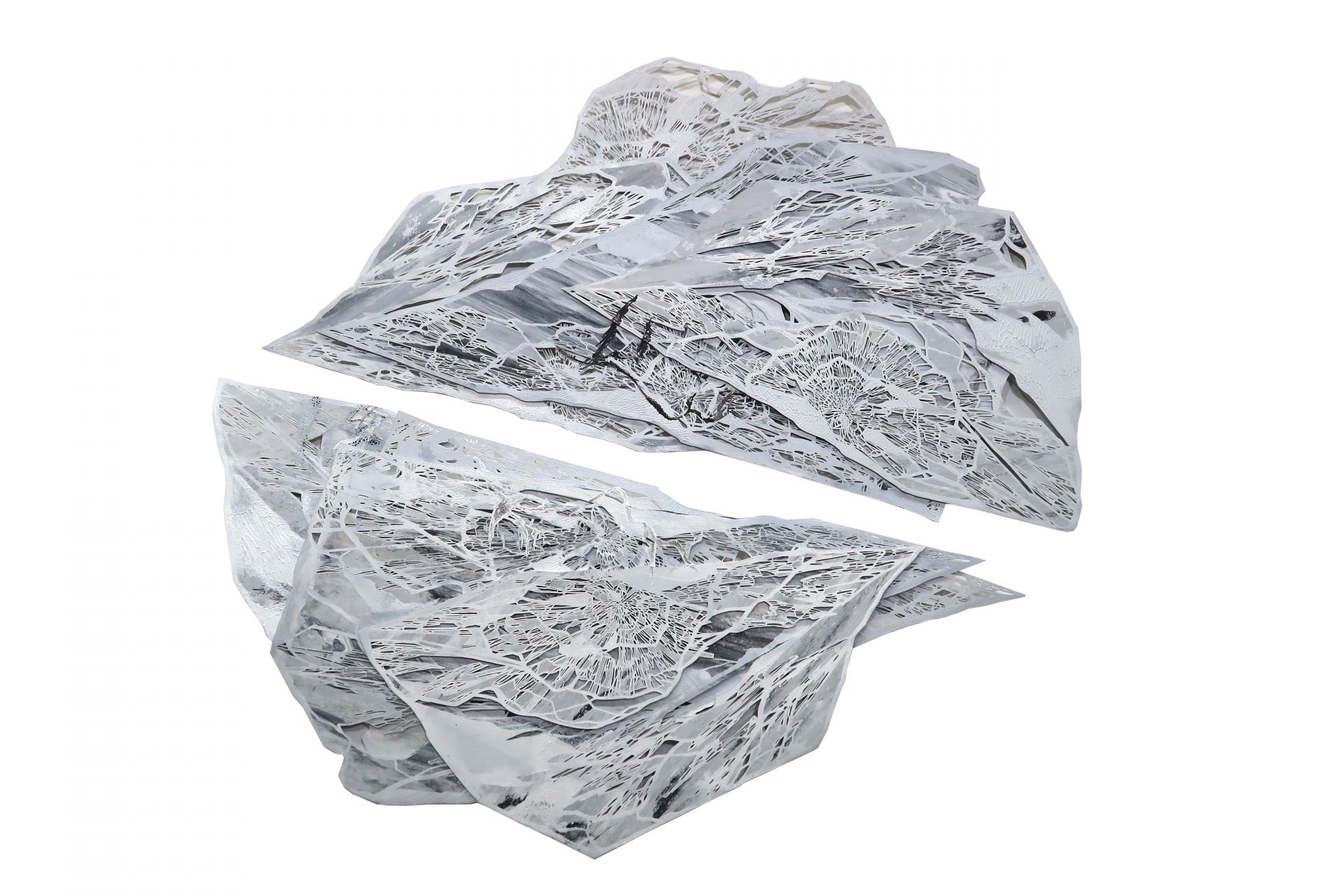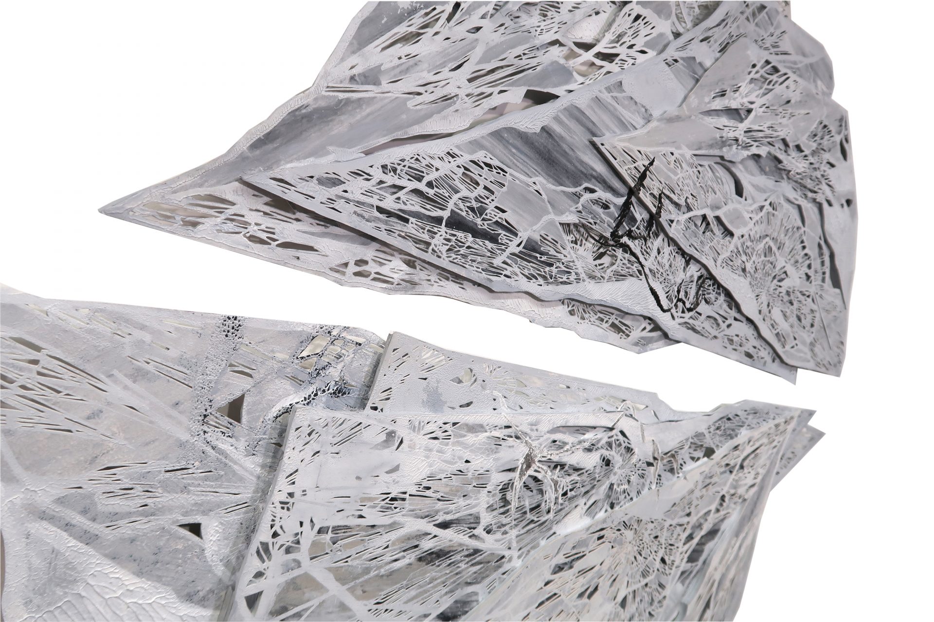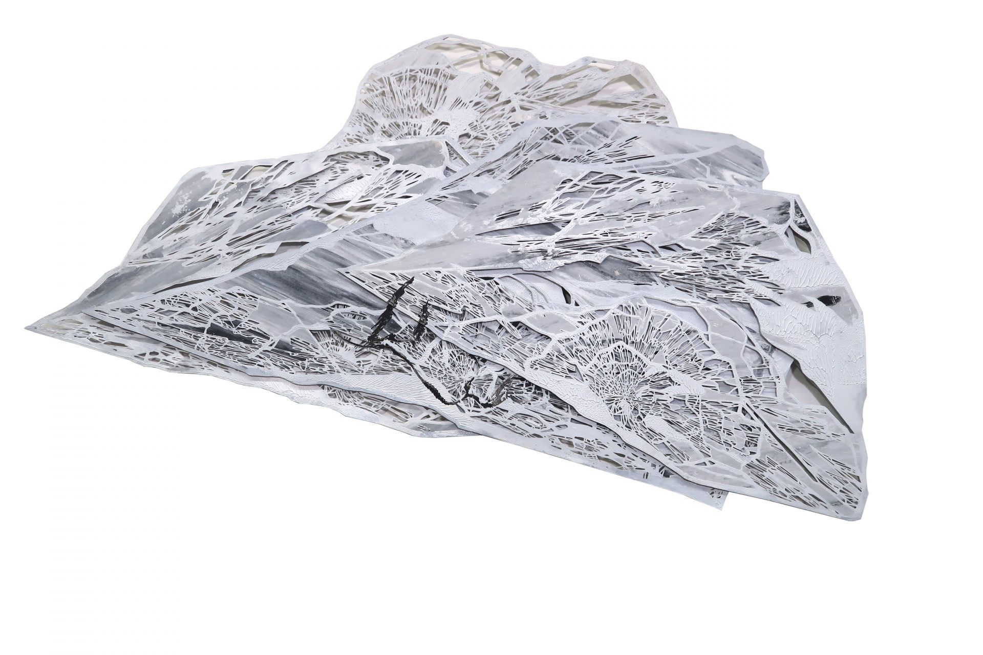 Nyx and Hemera are part of Melissa Tan’s ongoing series of paper relief works shaped after minor asteroids, many of which have been named after mythologicl figures. Nyx is named after the primordial goddess of the night in Greek mythology. She is mother to Hemera (Day), the three Fates, as well as Hypnos (Sleep), Thanatos (Death), Nemesis (Retribution) and Eris (Strife). In ancient art, Nyx is often shown paired with Hemera, a mirror image to symbolise Night and Day. Here they are portrayed as a pair of wings, and can be seen as individuals in their own right, or as two halves of a whole: Nyx with eyes closed, and Hemera awakening from sleep.