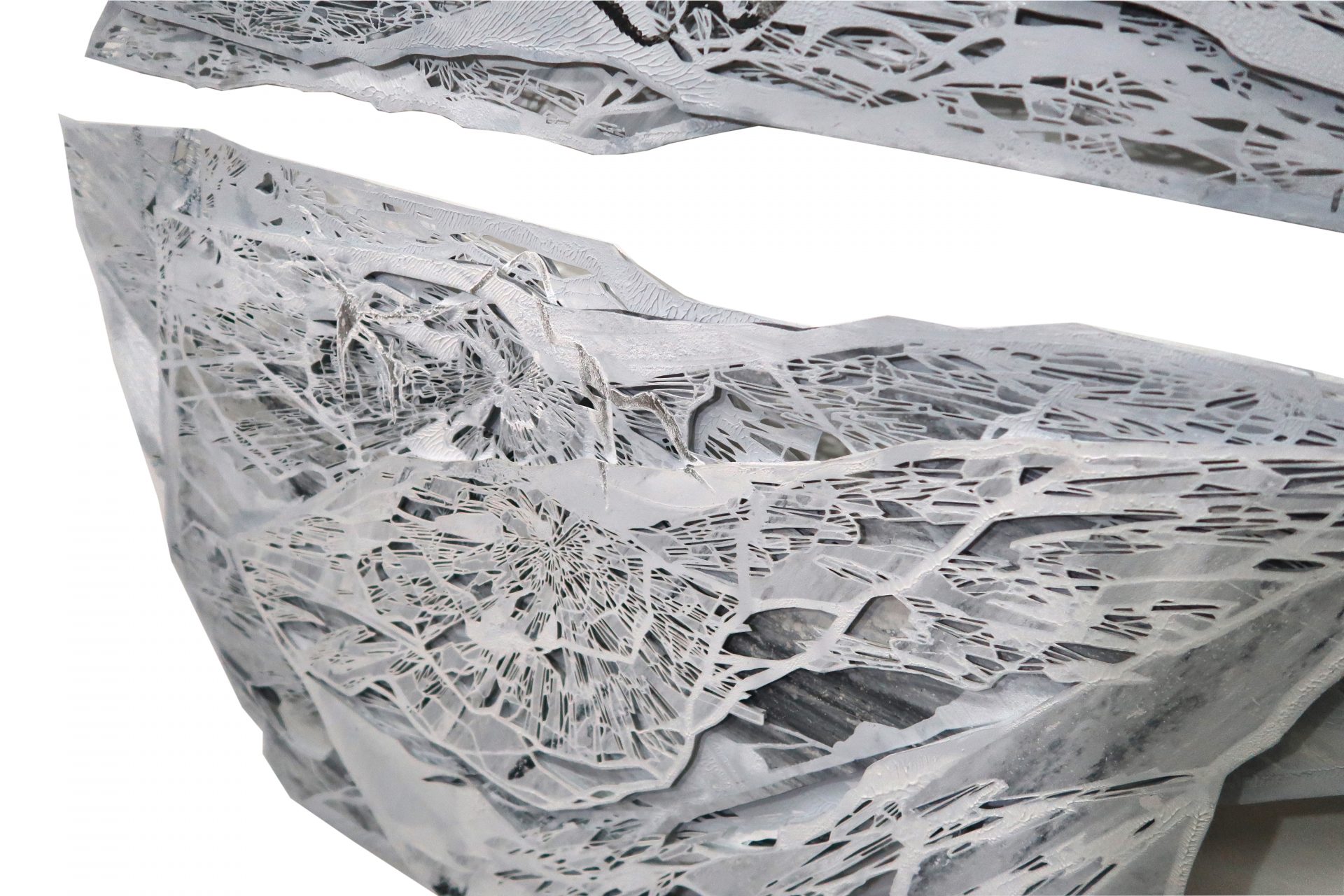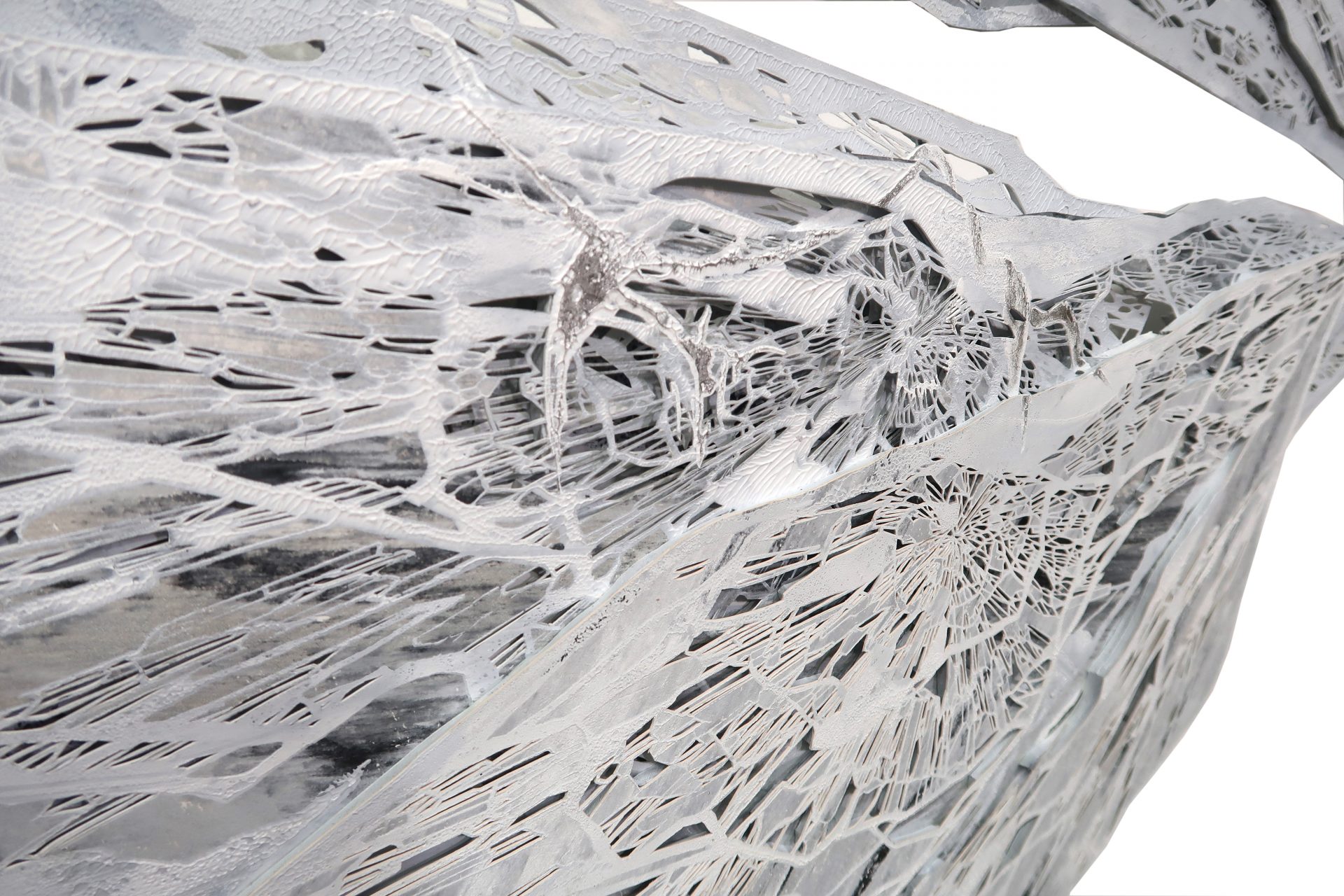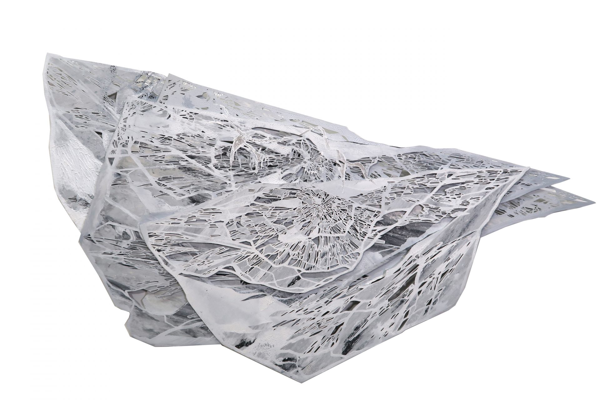 Nyx and Hemera are part of Melissa Tan’s ongoing series of paper relief works shaped after minor asteroids, many of which have been named after mythologicl figures. Nyx is named after the primordial goddess of the night in Greek mythology. She is mother to Hemera (Day), the three Fates, as well as Hypnos (Sleep), Thanatos (Death), Nemesis (Retribution) and Eris (Strife). In ancient art, Nyx is often shown paired with Hemera, a mirror image to symbolise Night and Day. Here they are portrayed as a pair of wings, and can be seen as individuals in their own right, or as two halves of a whole: Nyx with eyes closed, and Hemera awakening from sleep.