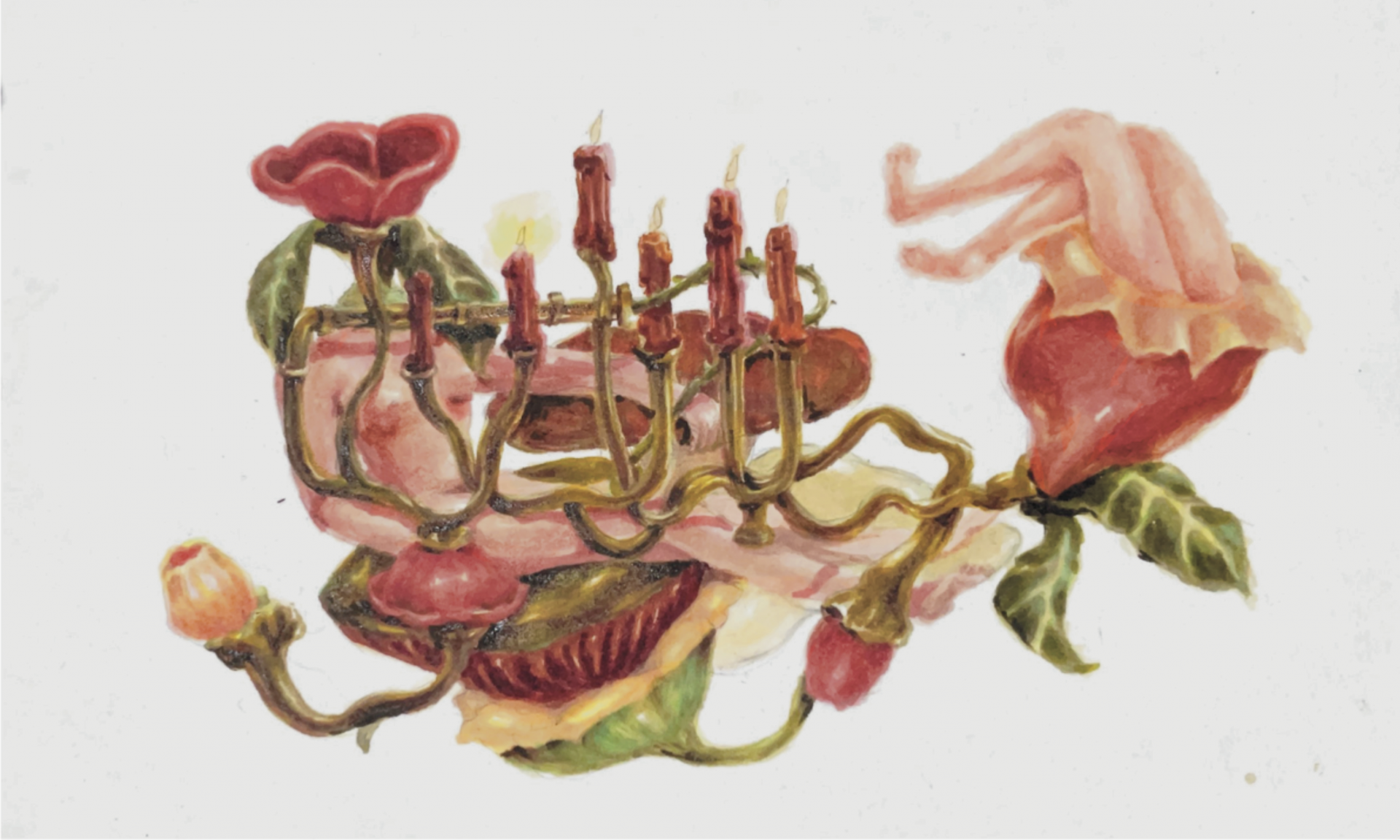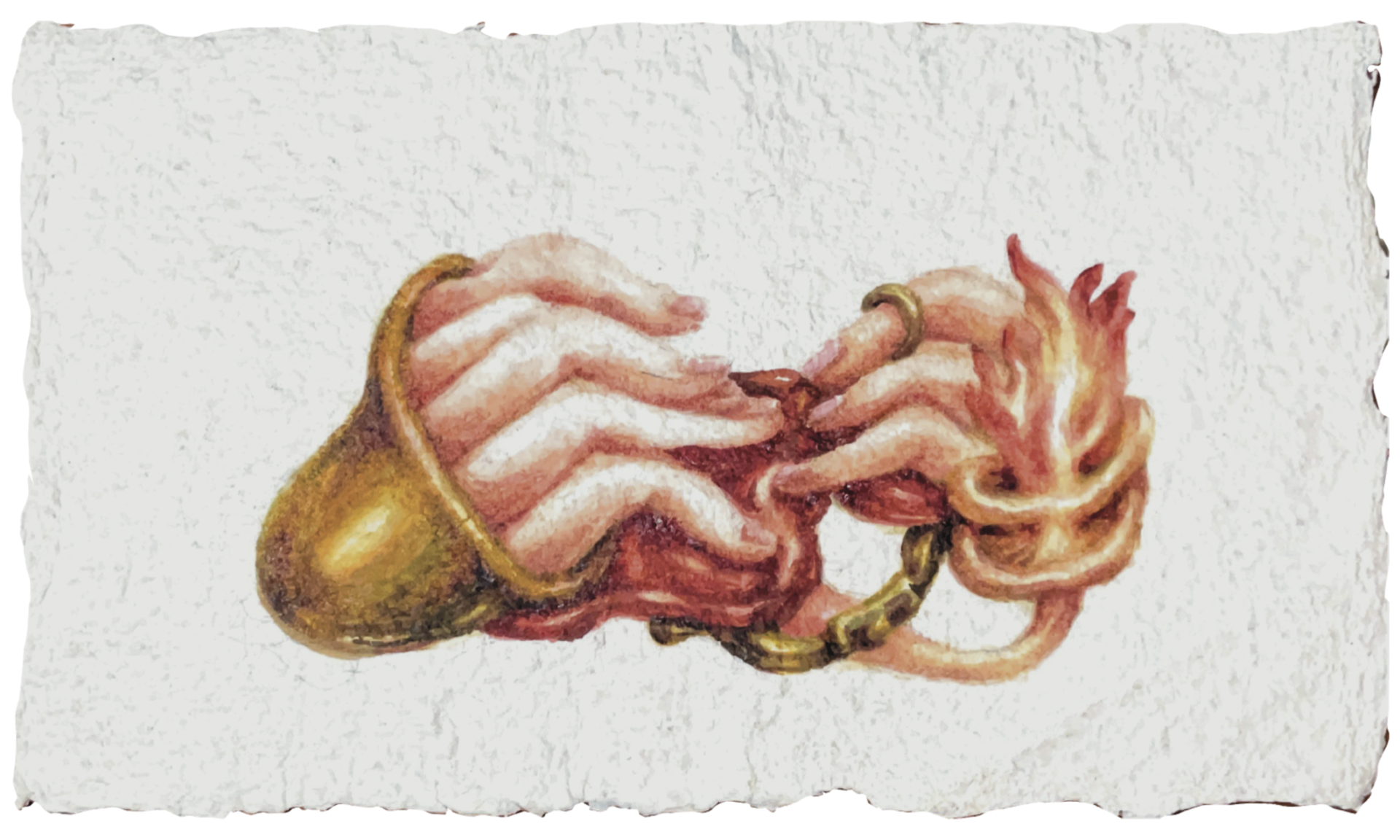 Yosefa Aulia’s delicate drawings portray an assortment of limbs and bodies intertwined with botanicals, birds and brass objects, the latter imagery stemming from her Catholic upbringing. Aulia describes these dream-like passages as an expression of her struggle to separate herself and her body from that of her ‘family body’. These images may also be read as the artist’s desire to imagine other possibilities and forms for her self, with various objects and organic forms functioning as extensions, supports, or coverings for bodily fragments. In other works, the flowering of limbs suggests impulses that cannot be contained, expressing a life-force bursting out of the bounds of propriety and control.