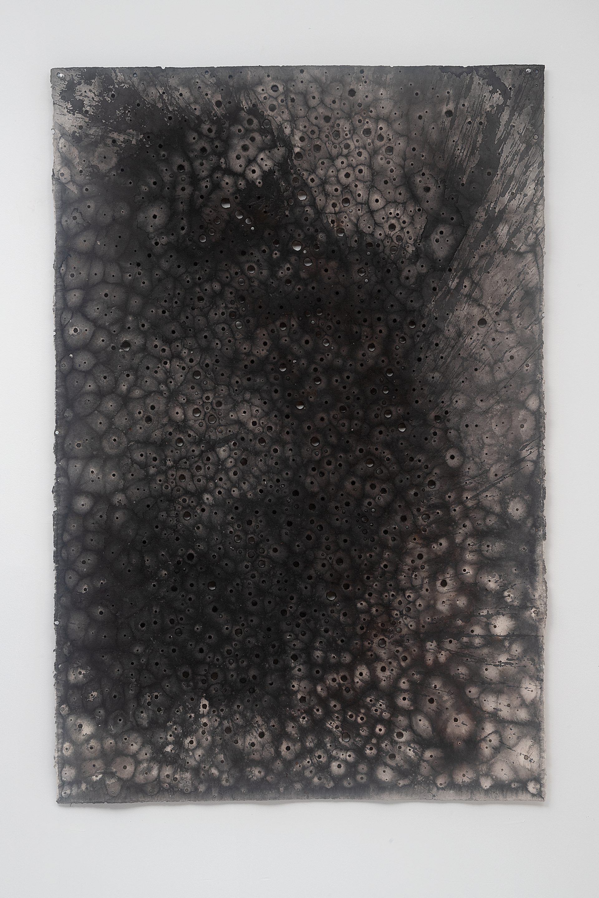Lee’s second piece at Appetite, forgetting, remembering (2020-21) also utilizes Chinese ink, but features what are perhaps even more intriguing media: fire and rain. With them, Lee creates a vortex of abstract holes and spots. In true Zen Buddhist nature, she lets the forces of nature take charge, coalescing onto this sheet of paper. Of her process, Lee explains, “A lot of the work I make now, I leave in a rainforest, and the rain has been making these most delicious works for me … there’s just something joyous about actually admitting and surrendering to something that is bigger than your control… It’s a kind of meditation and being present to something as it expresses itself.” This painting utilizes environment as a mark-maker, a process that Lee is “fascinated” by. Forgetting, remembering is a visualization of the immense forces of nature, much like Chinese scholar rocks (or “gongshi”) which also serve to inspire Lee. These hole-ridden, unusual rocks— and Lee’s painting— are shaped and sculpted by natural forces across time, eventually becoming, in form and in symbolism, microcosms of the universe. As the titular word “remembering,” indicates, this artwork is a documentation of the world in a moment; only for us to “forget” all that is washed away by rain or consumed by fire.