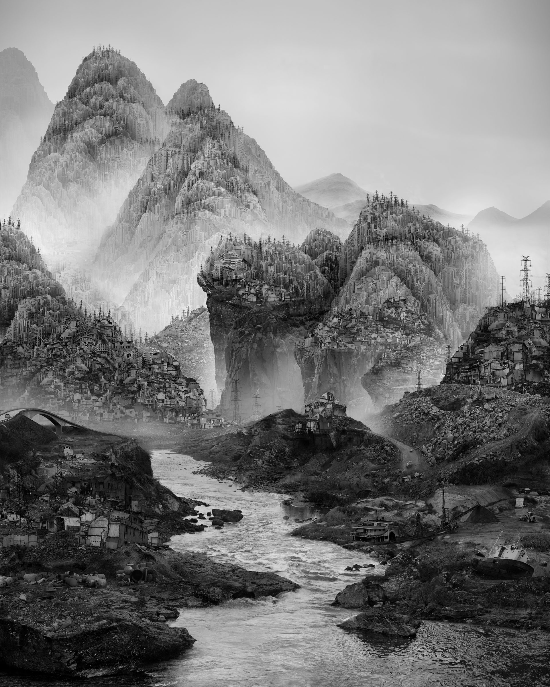 Yongliang’s compositions have their origins in traditional Chinese shan shui paintings—a style characterized by idealized, harmonious depictions of natural landscapes. Rather than a focus on realistic representation of scenery, the aim of a shan shui painting is to express the mystical effect of the natural world upon the artist. This practice also involves strict guidelines which a painting must follow: each scene must contain a ‘path’, ‘threshold’, and ‘heart’, and must adhere to principles of Chinese elemental theory with regards to color choice and mixing. As a result, the style is deeply symbolic in form and structure, with ties to Taoist ideas of harmonious existence with the natural environment. Yongliang’s work, at first glance, offers a monochromatic yet seemingly tranquil natural scene— only after close inspection are the grim cityscapes revealed.