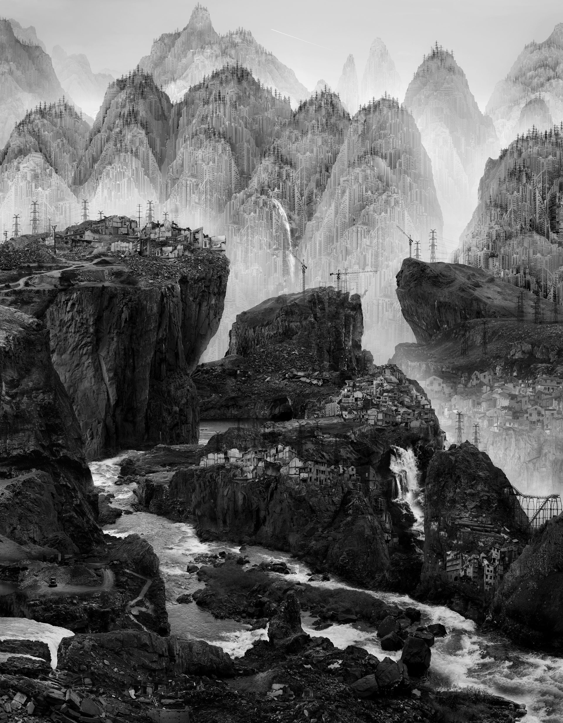 The Streams (2016) and Sinking (2016) also feature the most ubiquitous elements of city life: power lines, colossal motorways, rusty sheet metal, and crumbled asphalt. Industrial debris covertly fills out shanshui outlines, creating an uncanny harmony that elicits a second glance. Alongside considerations of environmental degradation and rampant globalization, Yongliang’s contemporary landscapes draw attention to the hyper-urbanized spaces we build and inhabit—and the likeness they share with organic worlds that can often seem fantastically remote. These images prompt us to ask: why might it matter that our city spaces can be so easily mistaken for naturalistic forms? What might this similarity say about a collective longing for something like the harmony expressed in shan shui paintings?