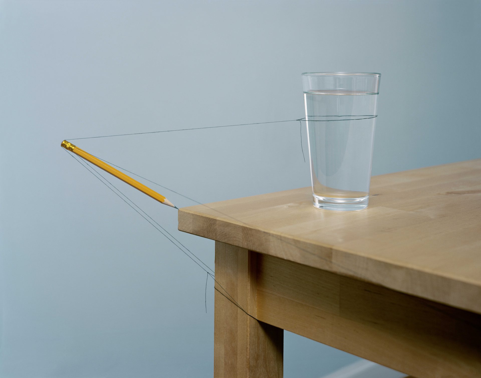 The works of Mauricio Alejo transform everyday objects by inserting them into unusual contexts. Usually constructed as sculptural assemblages and then photographed, they are brought into new narratives which defy their functionality and are displaced from their contexts. In Dinner Table (2012), an imaginative, precariously-balanced and temporary suspension seems destined to collapse at any moment, held in place by tension.
