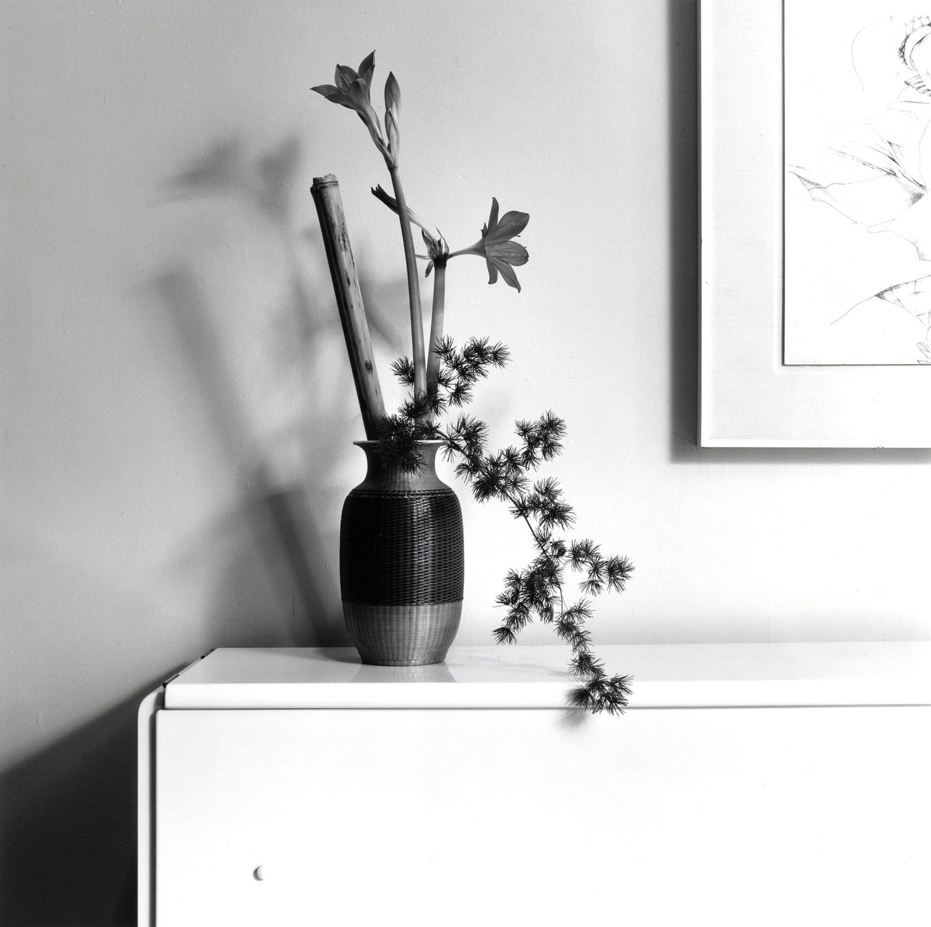 The playful bush, sparse yet distinct, runs across the chest of the image. The tilt of the neck of flowers, the touch of bristle on stem, the lean. The shapely, tubular pants contain the flourish of stoic blooms. The dance of lines in the far corner. The resolute nipple of a cabinet.