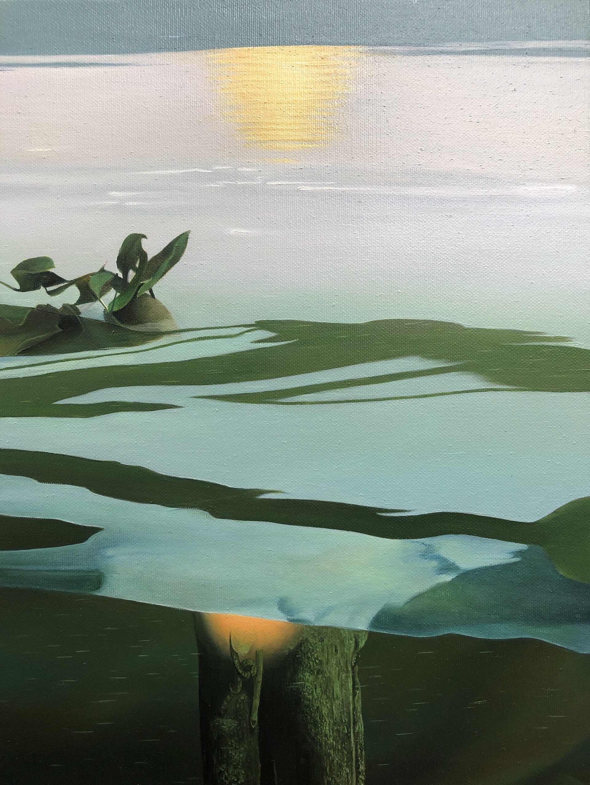 This absence shaped Rhomadioni’s perception of the site as a space where softness, stillness, and gentleness exist without the presence of overt power structures, a sensibility he translates into the two paintings. A charged stillness permeates Chapter I, with its landscape composed of several numinous objects – a statue, a tree, stones, and flowing water. In contrast to the warm sienna tones of Chapter I, Chapter II is characterized by a predominantly cool palette, and exudes the same serenity tinged with a sense of mystery. Beneath the placid surface of the water, another world is intimated in its infinite depths. The lyrical linework and asymmetrical composition of both paintings produce a sense of fluidity and malleability: like a shapeshifting vision, or mirage. Rhomadioni is not attempting to reconstruct the historical narrative of the site that inspired these works; rather, he attunes himself to its atmosphere: calm, gentle, and free from any form of domination. In this context, it becomes a reflection on the quality of the feminine in sustaining an ecological balance.