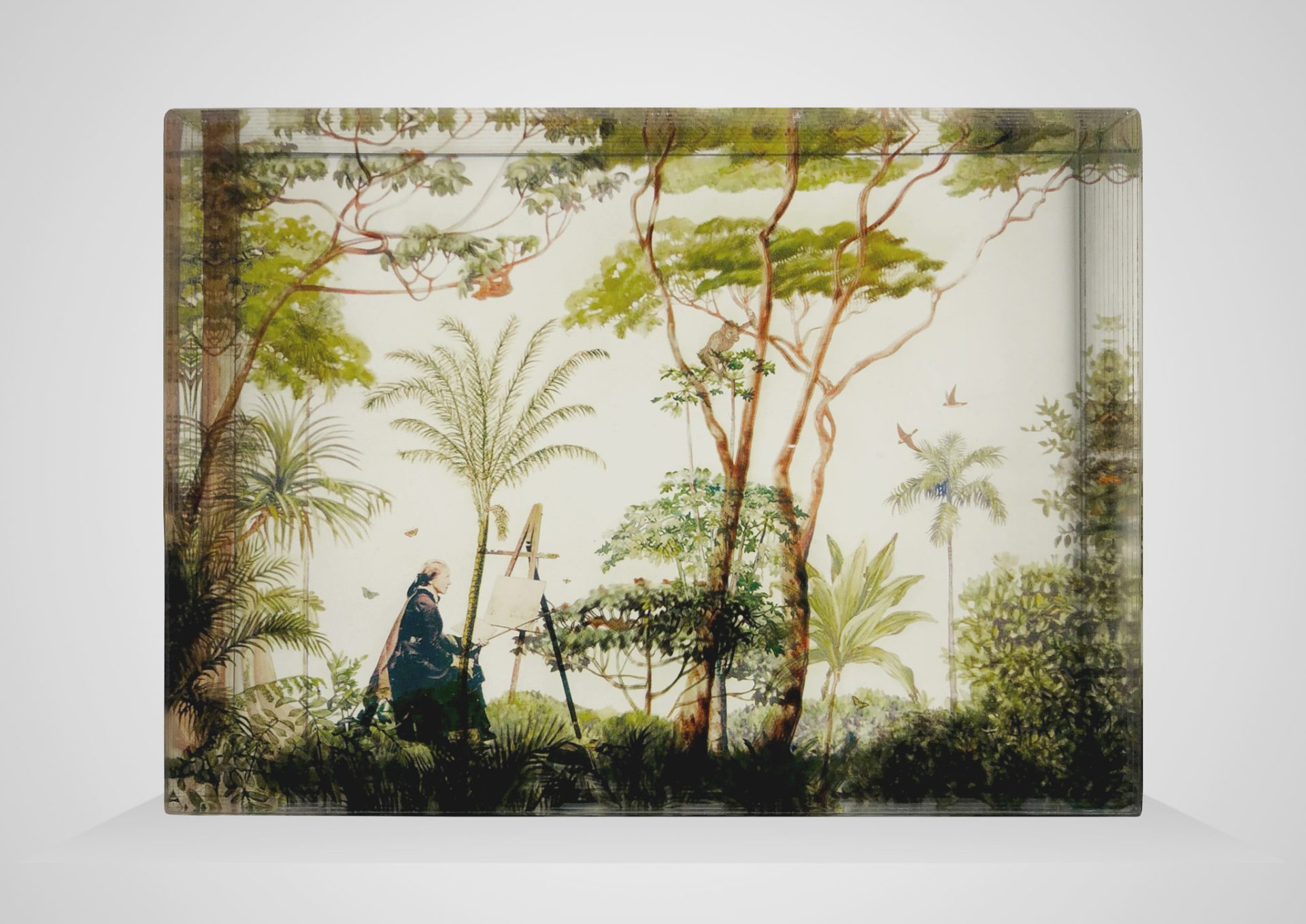 The title of the work makes reference to how representations of the tropics have historically been filtered through the genre of landscape painting, boasting dramatic or idealised views, and sensational flora and fauna. These vistas were often composed not from first-hand observation or experience, but cobbled together from botanical illustrations, travellers’ accounts, and pure conjecture. In contrast, North was known to paint directly in-situ, often dedicating hours or even days to meticulously capturing the landscapes before her. Ong’s works are a celebration of the courage and immersive dedication of intrepid female explorers, and the honesty with which they sought to communicate their observation and experience of the forest and of nature, in turn inviting viewers to consider how the natural world is seen, remembered, and represented.