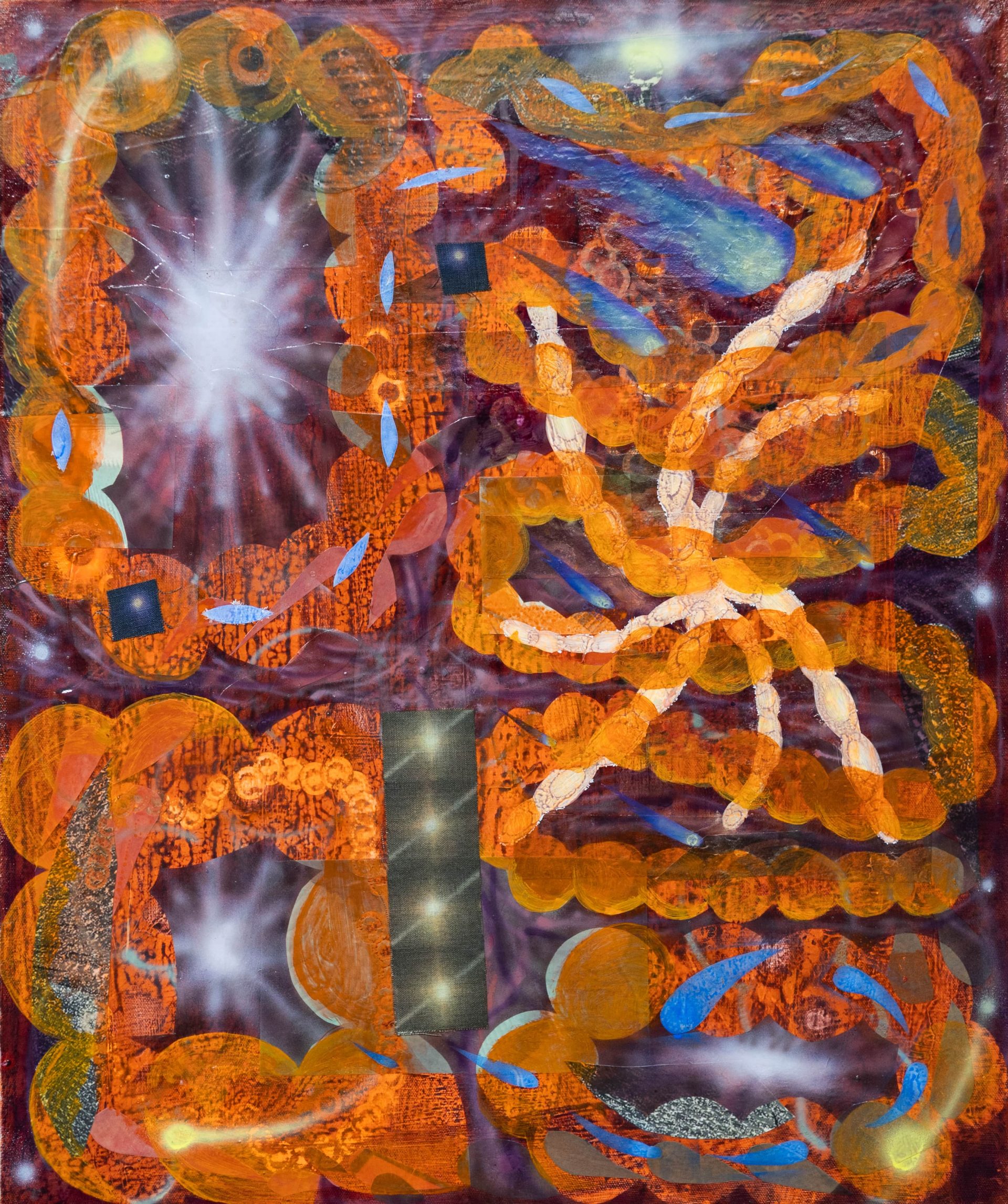 Ng notes that the human body also has a hidden celestial nature, with its essential building blocks of nitrogen, carbon and iron formed in the heart of stars. In Two scales of time in the body, Ng turns inwards, to intersect internal biology with astronomy. Images of supernovae are abstracted to form interlocking ovals, evoking the archetypal worm(hole) as well as the digestive organs, thus connecting the material body to cosmic time. Similar to its blue companion (Time travelling in Chinese), here, the particles travel through portals – bodily as well as celestial.
