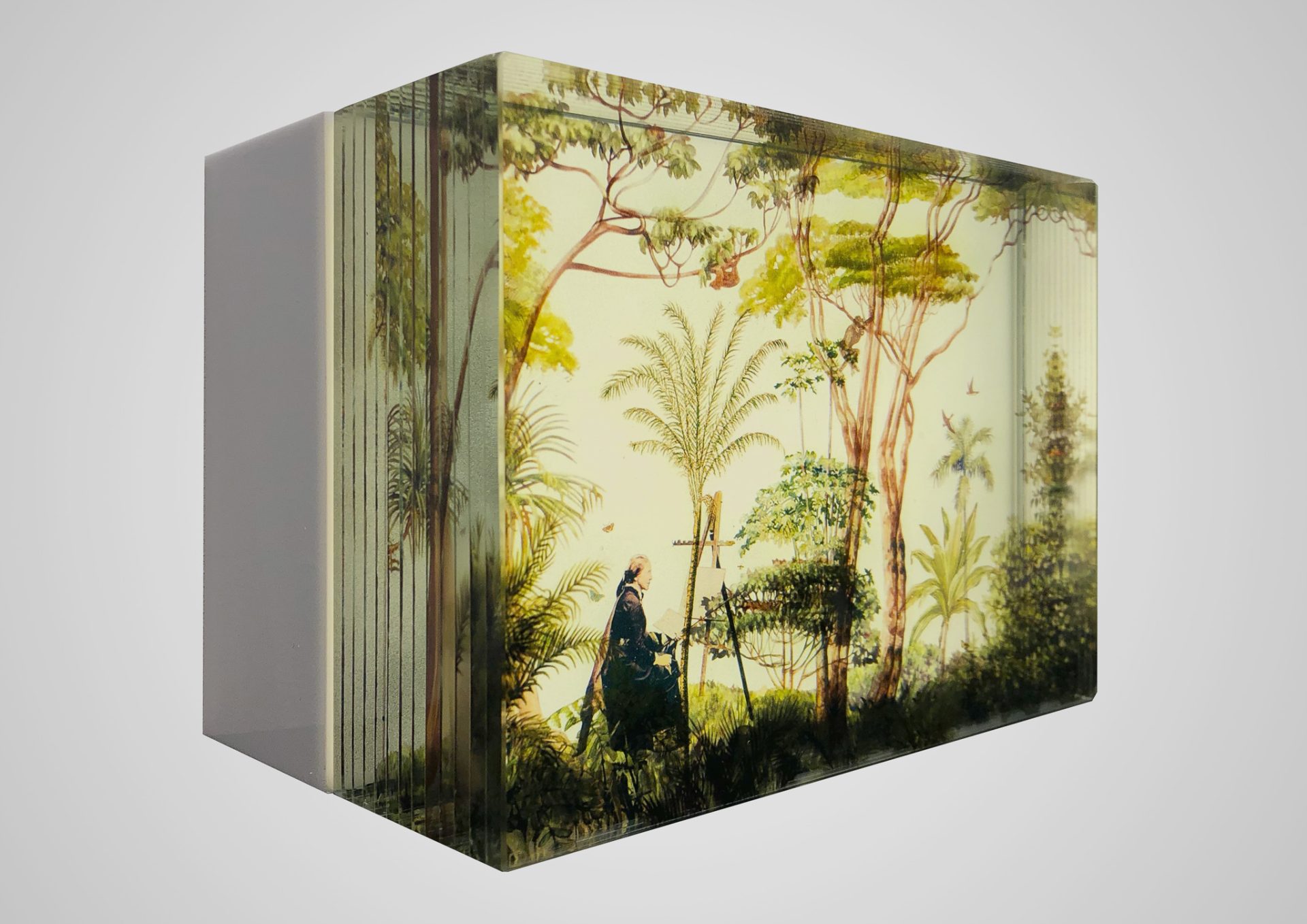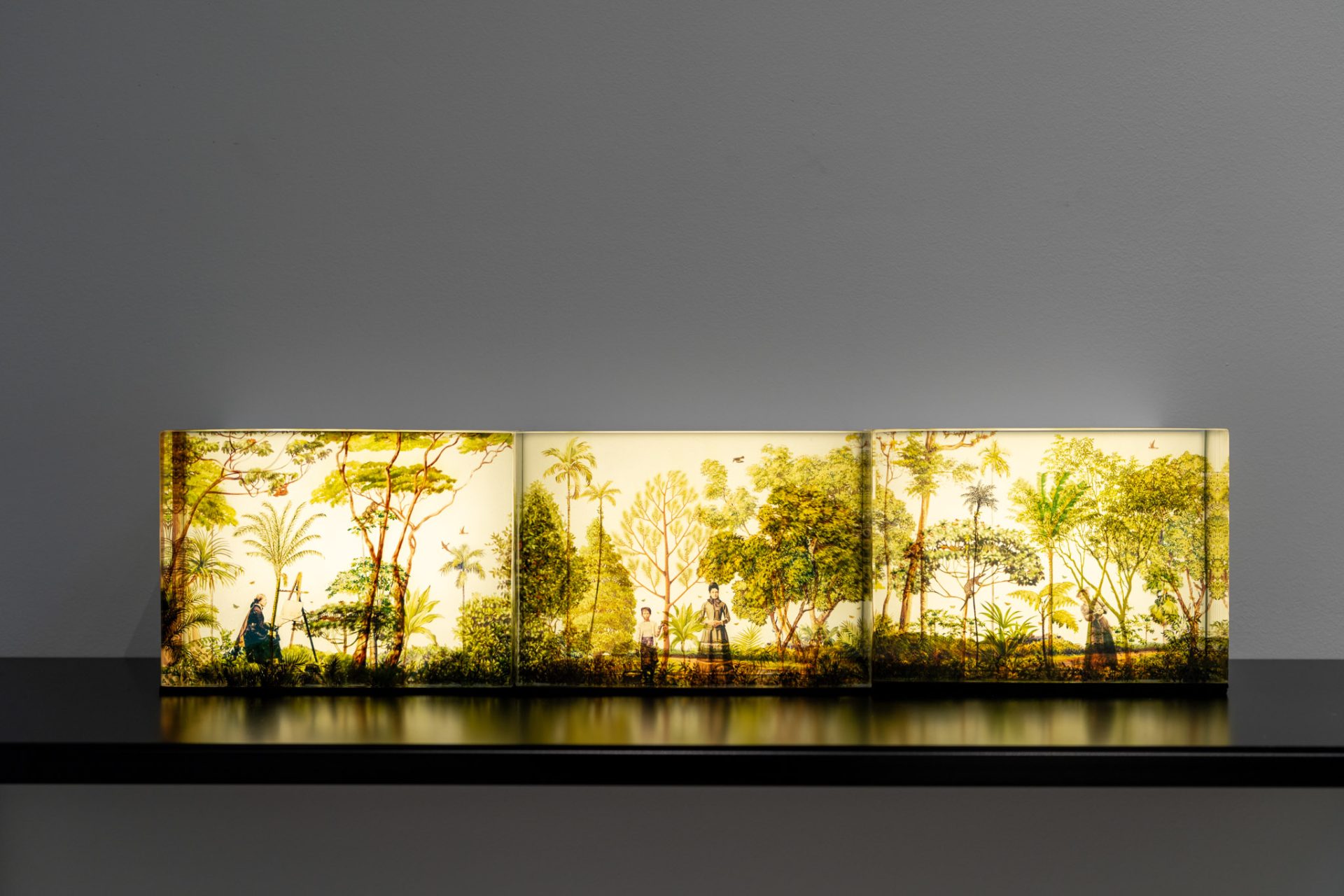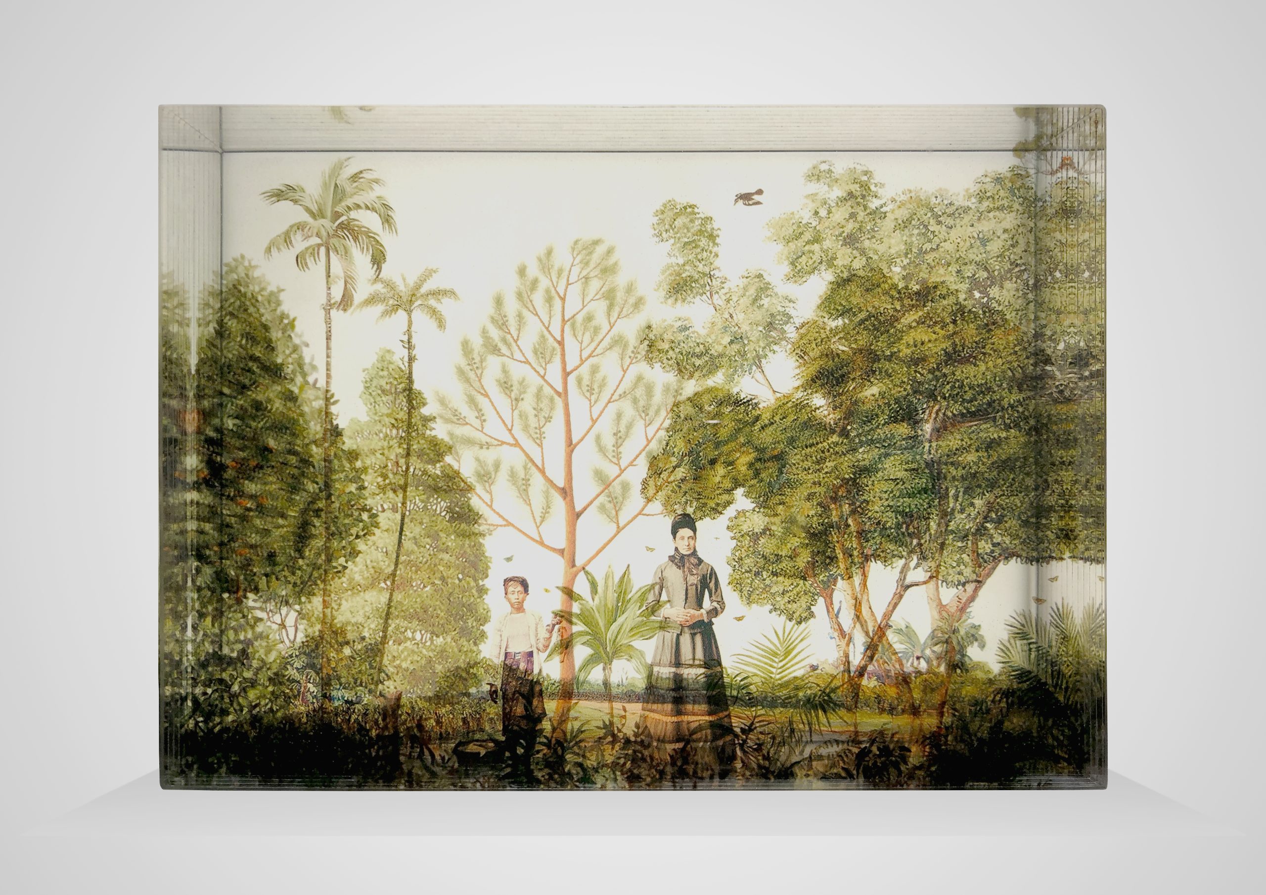 Donna Ong’s intricately detailed dioramas invite viewers to step into a layered and multifaceted exploration of the tropical forest. These three-dimensional tableaus are composed from imagery drawn from English biologist Marianne North’s (1830 – 1890) depictions of tropical landscapes, interspersed with representations of early, lesser-known female explorers such as North herself and naturalist Isabella Bird (1831 – 1904). Interwoven with these historical figures are images of rarely-seen depictions of Southeast Asian animals such as the civet cat, and local people, emphasizing the intertwining of natural and human worlds within the tropical forest.