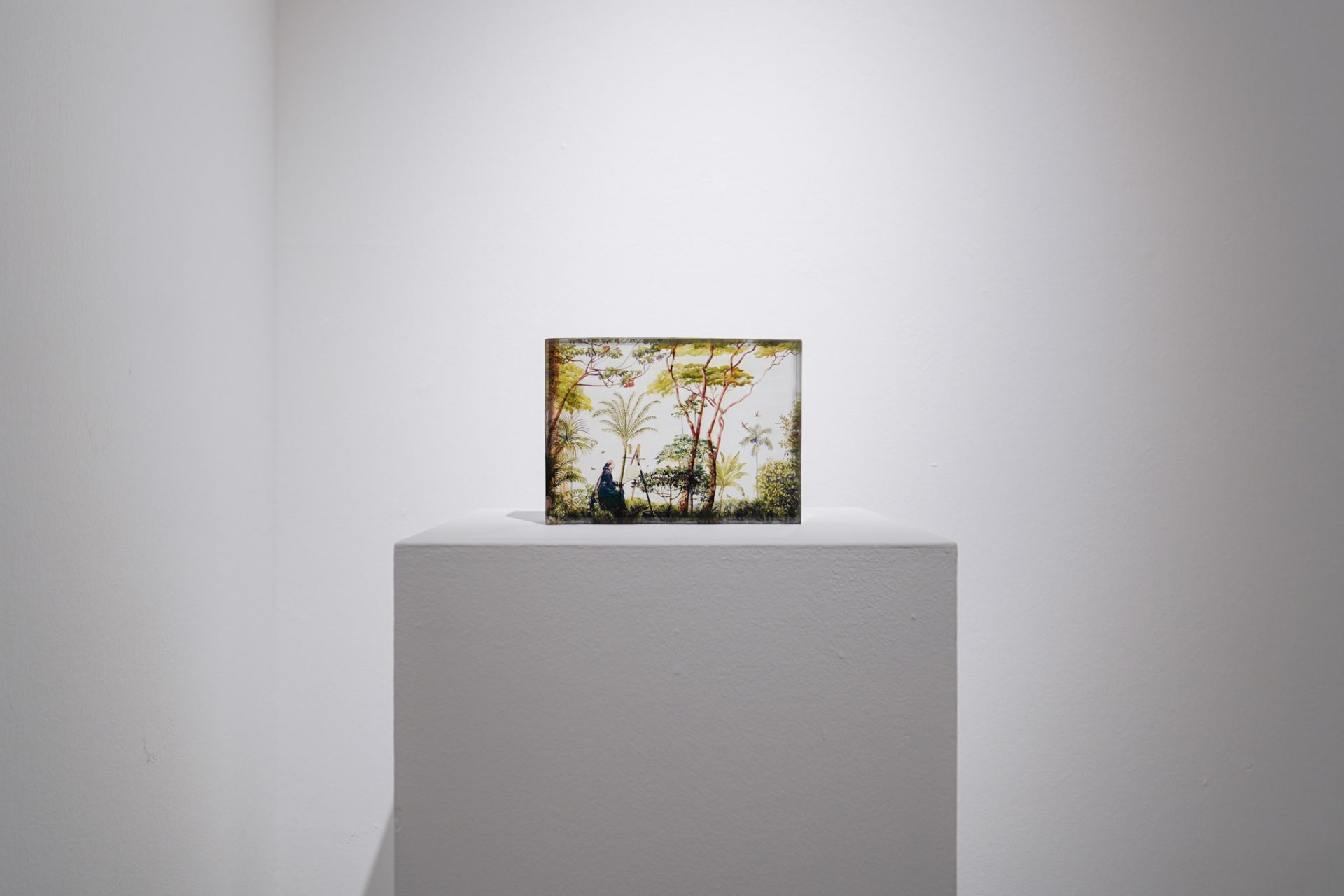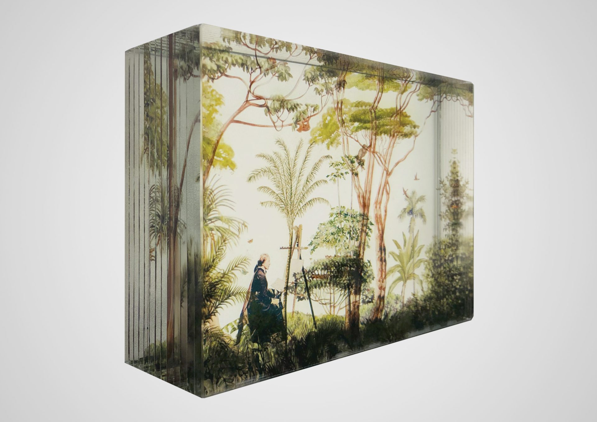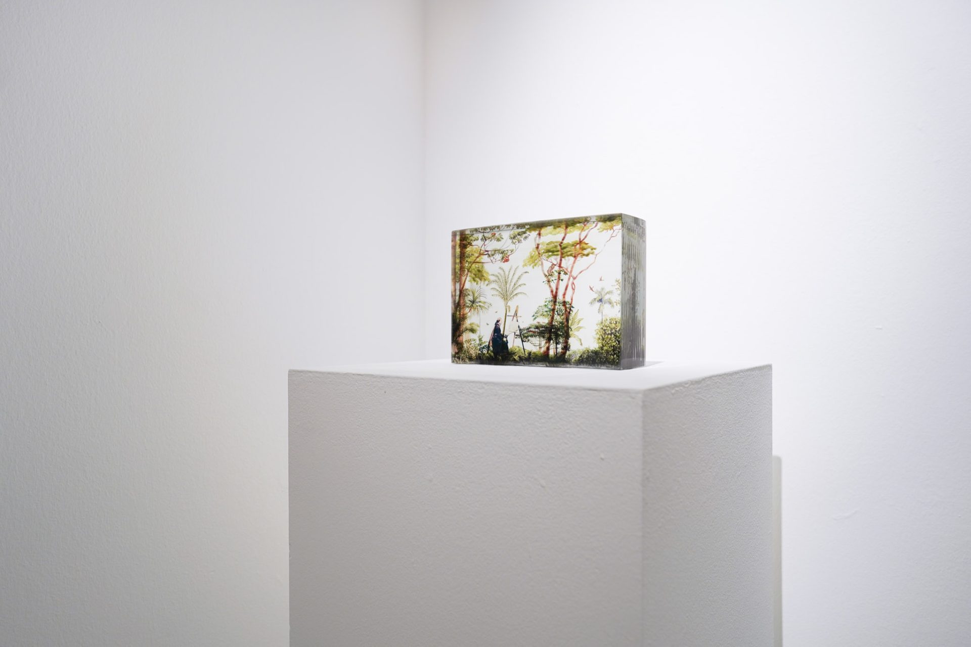Donna Ong’s intricately detailed dioramas invite viewers to step into a layered and multifaceted exploration of the tropical forest. These three-dimensional tableaus are composed from imagery drawn from English biologist Marianne North’s (1830 – 1890) depictions of tropical landscapes, interspersed with representations of early, lesser-known female explorers such as North herself and naturalist Isabella Bird (1831 – 1904). Interwoven with these historical figures are images of rarely-seen depictions of Southeast Asian animals such as the civet cat, and local people, emphasizing the intertwining of natural and human worlds within the tropical forest.