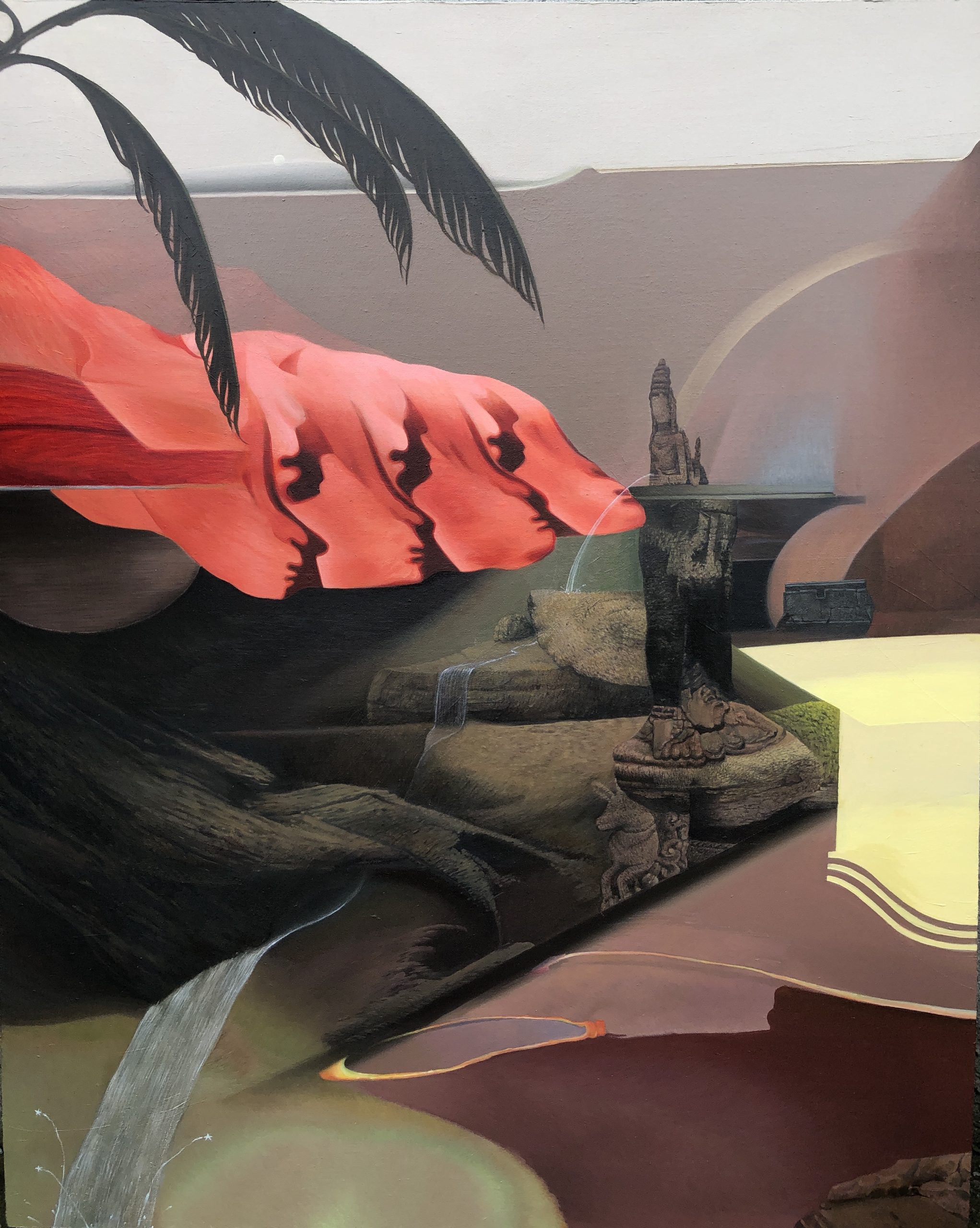 Enggar Rhomadioni’s evocative paintings, Altar Kelambu Basah (Soaked Veil Altar), extend his exploration of femininity — a quality revered in ancient Javanese culture and one he sensed as stillness and purity during his visit to an archaeological site in Nglurah Village, Central Java. At the site, Rhomadioni encountered statues of Durga — the Hindu goddess symbolizing strength and cosmic protection – as well as the yoni, a symbol of fertility. Notably however, there was no lingga present, the counterpart that traditionally signifies masculine power.