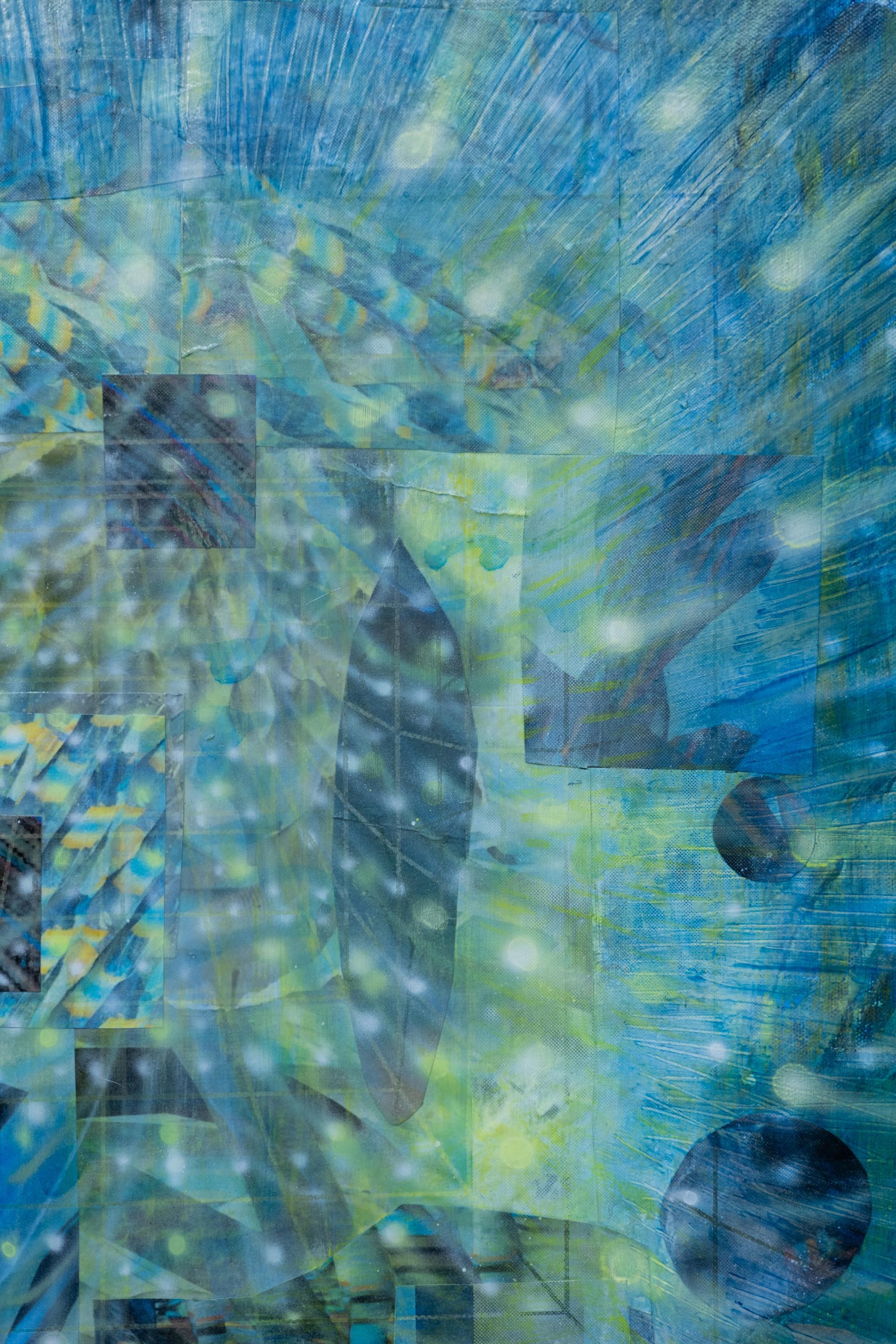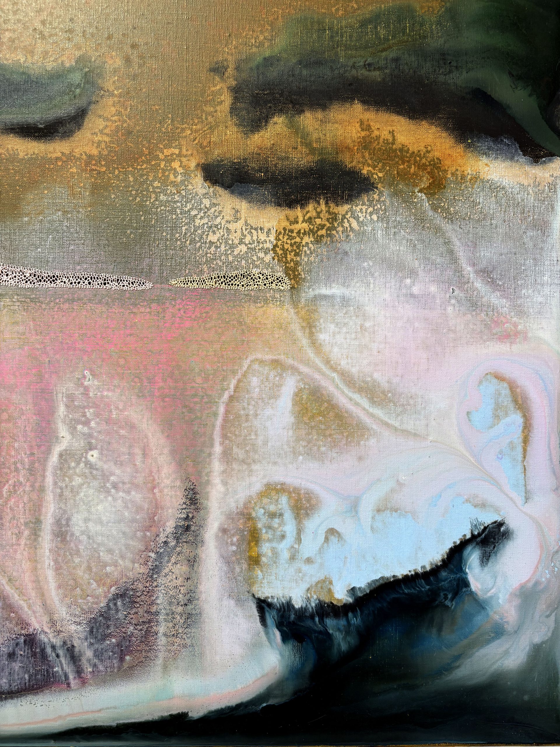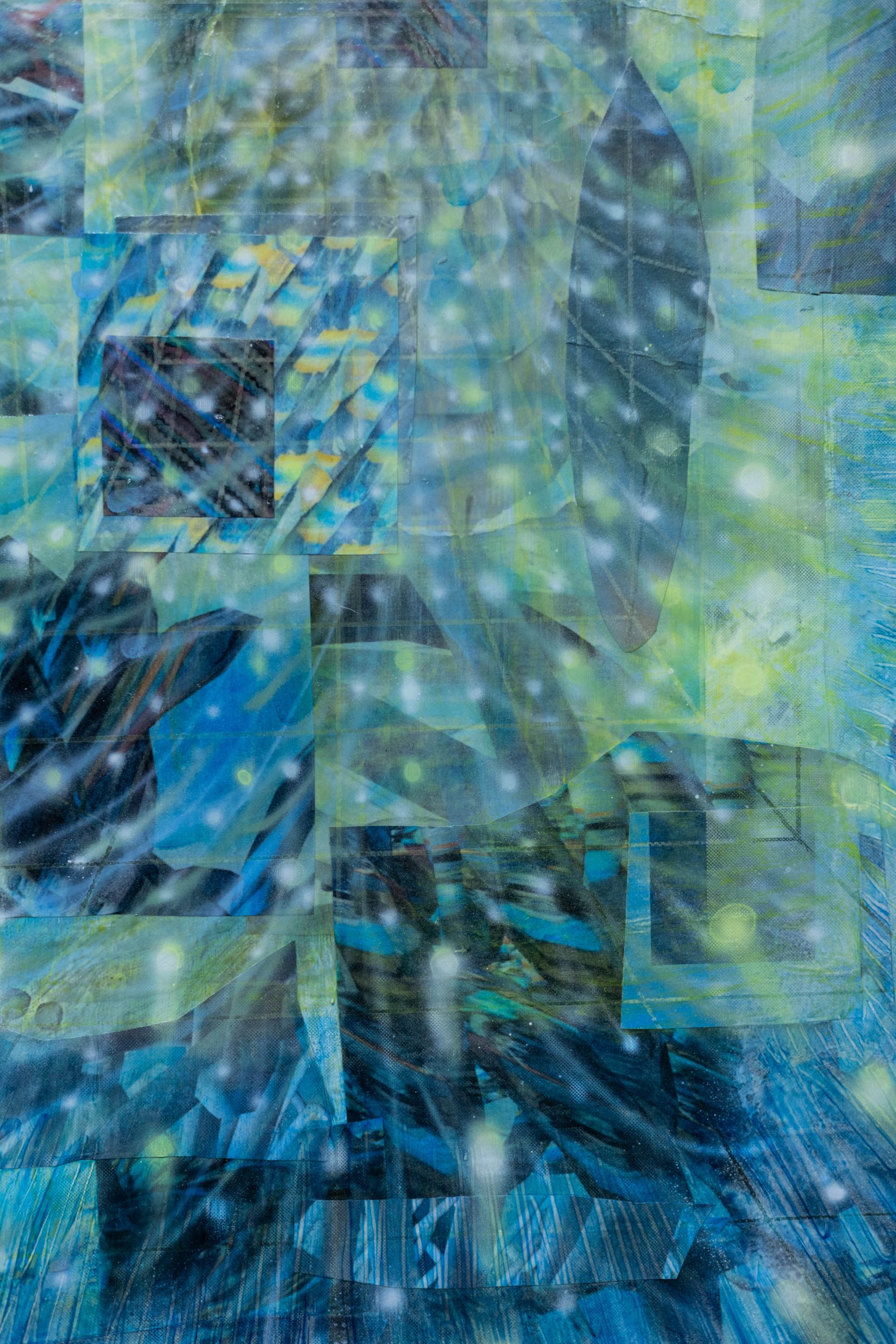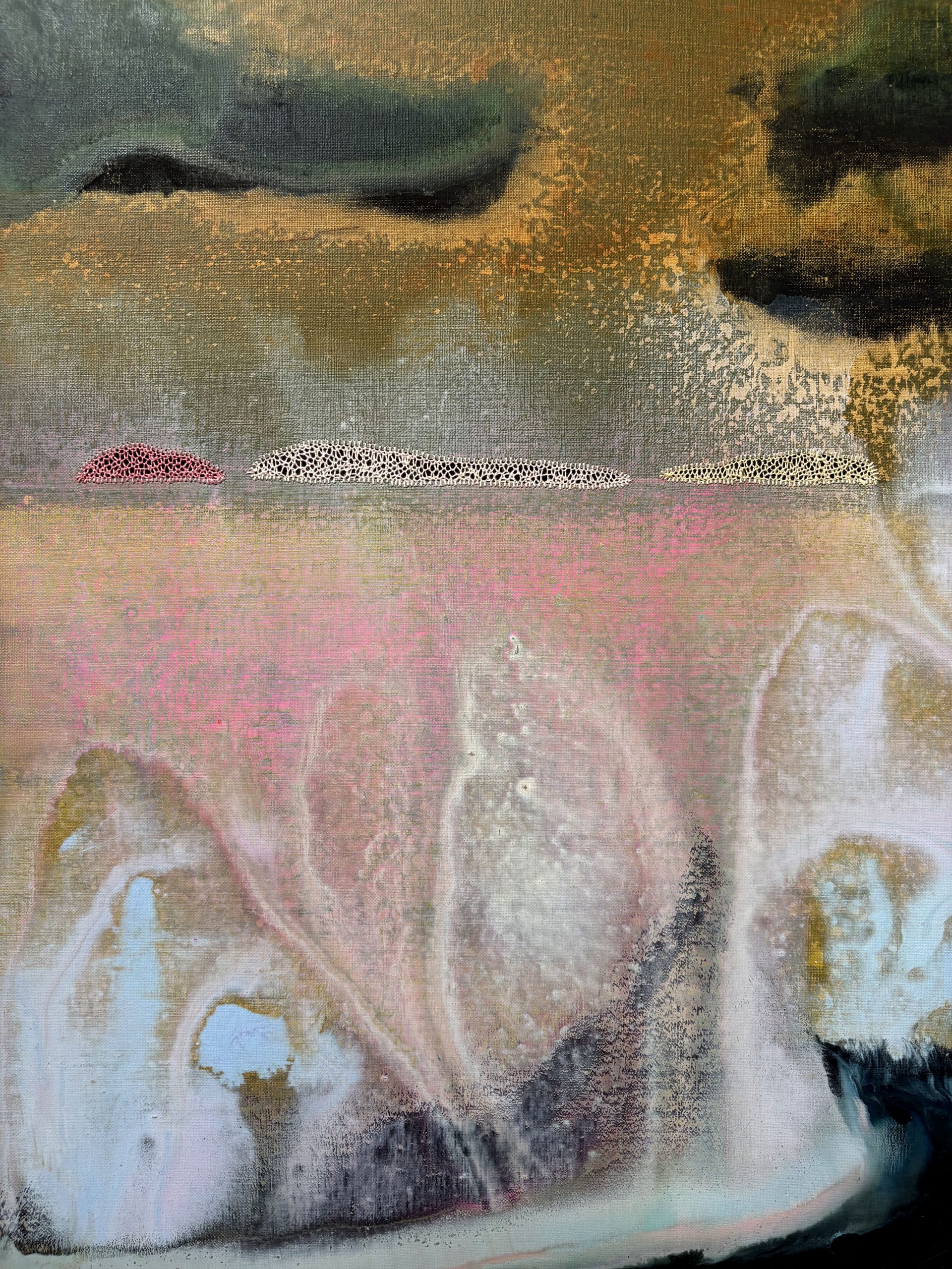 Windy Day evokes the restless atmosphere of a day shaped by unseen currents of air, where colour and form shift as if carried by the wind. The broad swathes of paint swirl and flow across the canvas like the weather itself – fleeting, unpredictable, and alive. Boundaries between sky, land, and water dissolve, suggesting a landscape that cannot remain fixed, but instead bends, stretches, and transforms. In this way, the landscape becomes a metaphor for endurance amid constant change. The wind, although invisible, leaves palpable traces of its force; it unsettles but also renews. Thread stitched into the canvas, mirrors this condition of vulnerability and strength – a reminder that turbulence can also open space for adaptation, hope, and continuity.