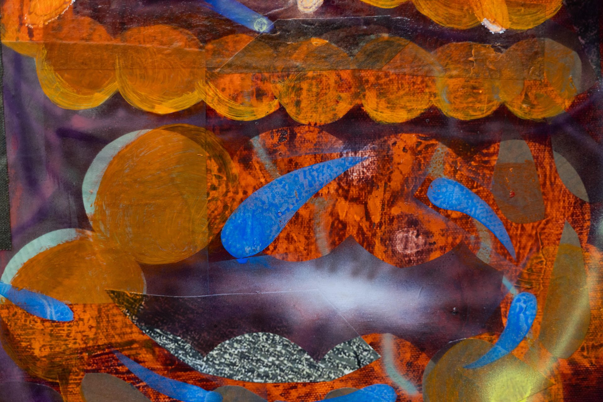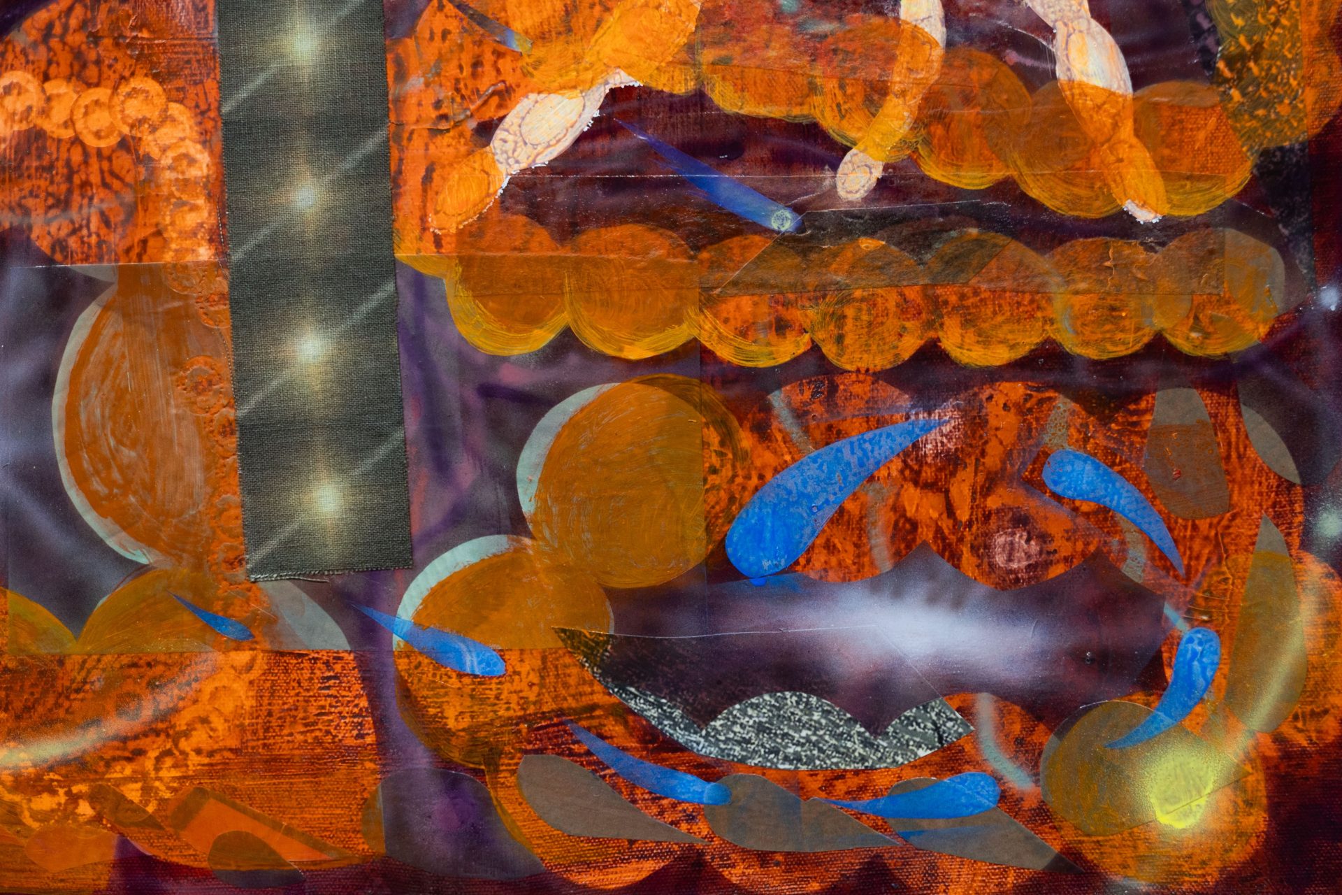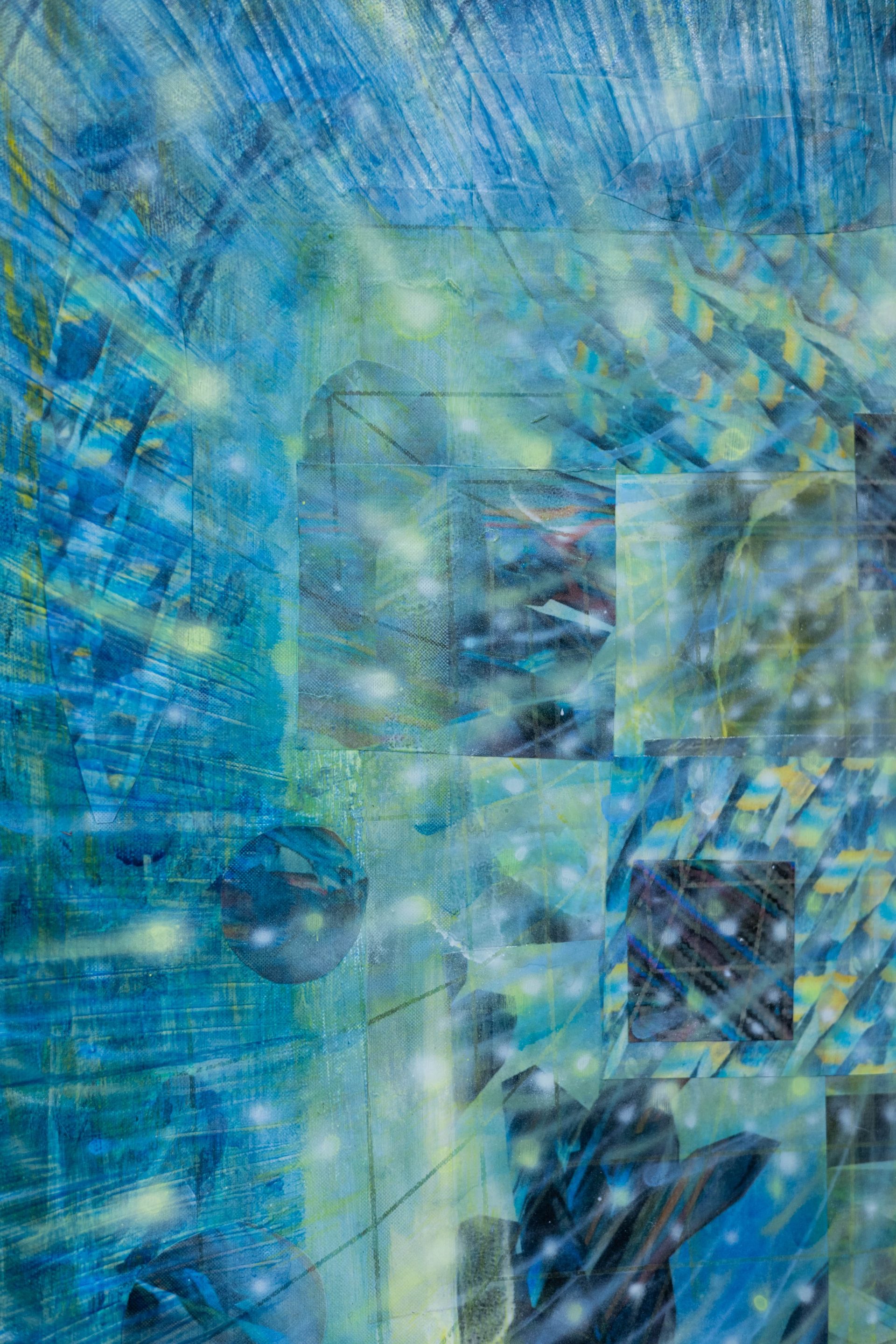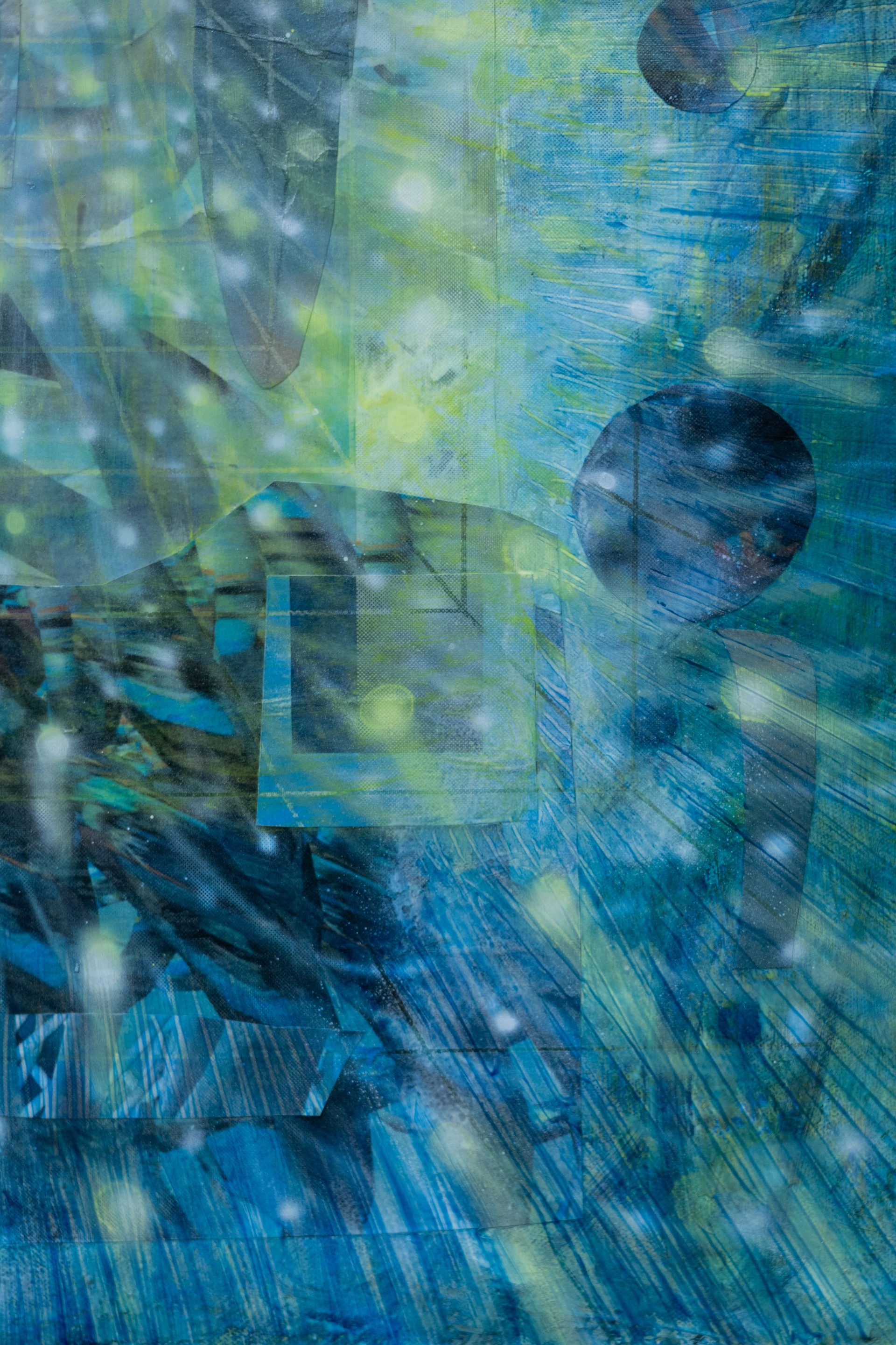 Windy Day evokes the restless atmosphere of a day shaped by unseen currents of air, where colour and form shift as if carried by the wind. The broad swathes of paint swirl and flow across the canvas like the weather itself – fleeting, unpredictable, and alive. Boundaries between sky, land, and water dissolve, suggesting a landscape that cannot remain fixed, but instead bends, stretches, and transforms. In this way, the landscape becomes a metaphor for endurance amid constant change. The wind, although invisible, leaves palpable traces of its force; it unsettles but also renews. Thread stitched into the canvas, mirrors this condition of vulnerability and strength – a reminder that turbulence can also open space for adaptation, hope, and continuity.