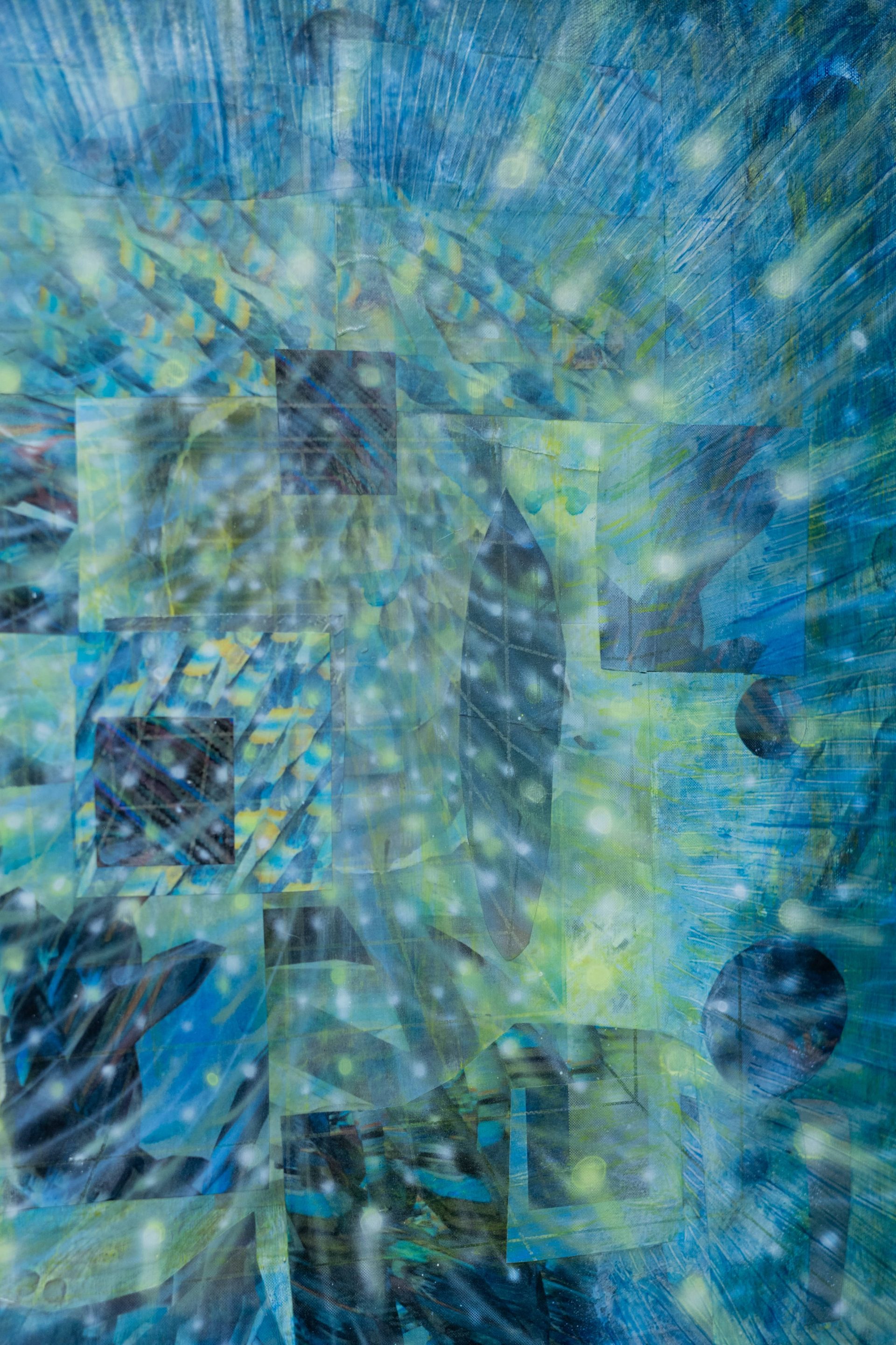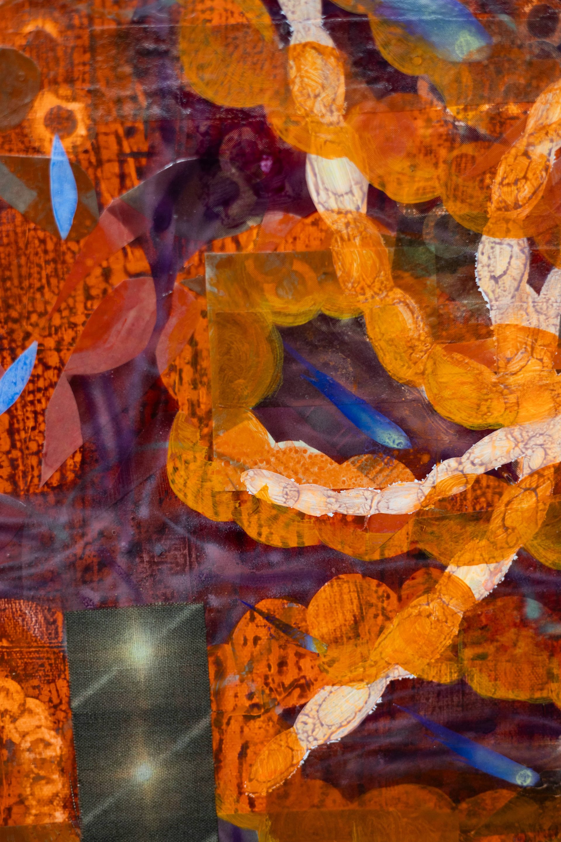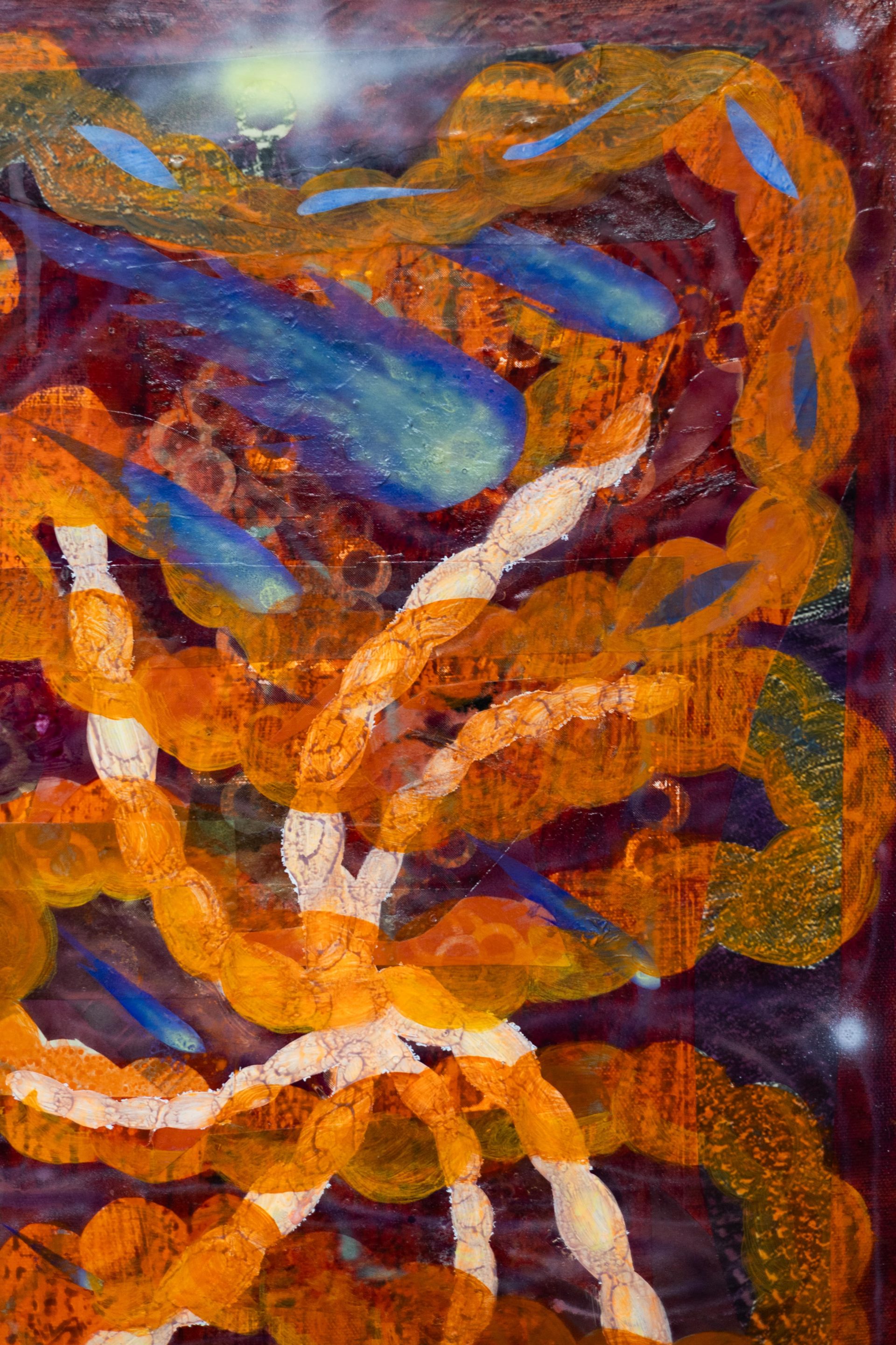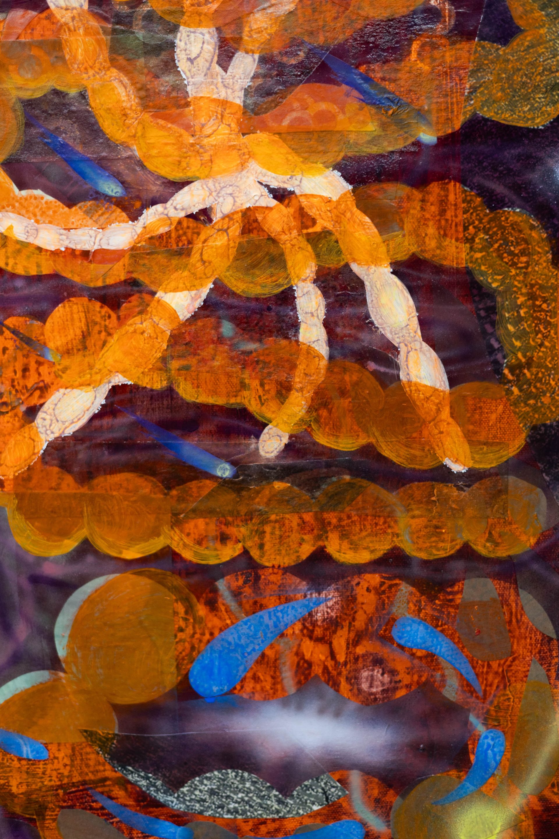 Ng notes that the human body also has a hidden celestial nature, with its essential building blocks of nitrogen, carbon and iron formed in the heart of stars. In Two scales of time in the body, Ng turns inwards, to intersect internal biology with astronomy. Images of supernovae are abstracted to form interlocking ovals, evoking the archetypal worm(hole) as well as the digestive organs, thus connecting the material body to cosmic time. Similar to its blue companion (Time travelling in Chinese), here, the particles travel through portals – bodily as well as celestial.
