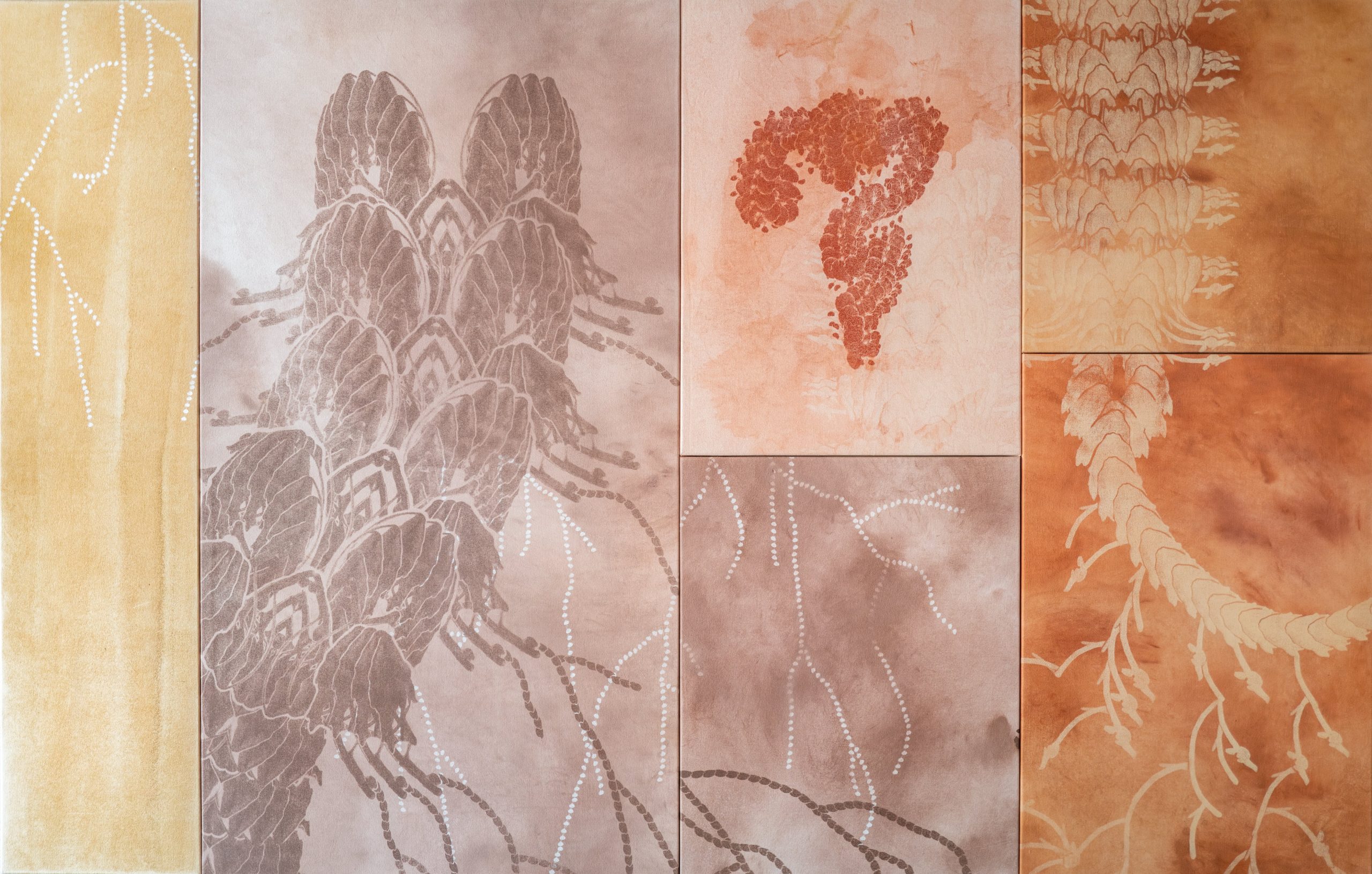 Rhizomorph 1 continues these interests, exploring root systems and mycelium as natural connectors between all living species in the soil. In a time of ecological and societal precarity, when intolerance and isolation are increasingly present, the artist sees these often hidden and organic networks as symbols of how we could connect with one another beyond our differences. Beneath the surface, the mycelium reaches out to different species, creating a shared ecosystem built on communication and exchange, balance and interdependence. The forms in Katamso’s work are drawn from microscopic observations of grass roots, and hand-printed with soil pigments. Their shadowy silhouettes, inspired by animistic figures from Balinese and Javanese culture, have a primordial quality akin to cave paintings, recording the new myths of our time.